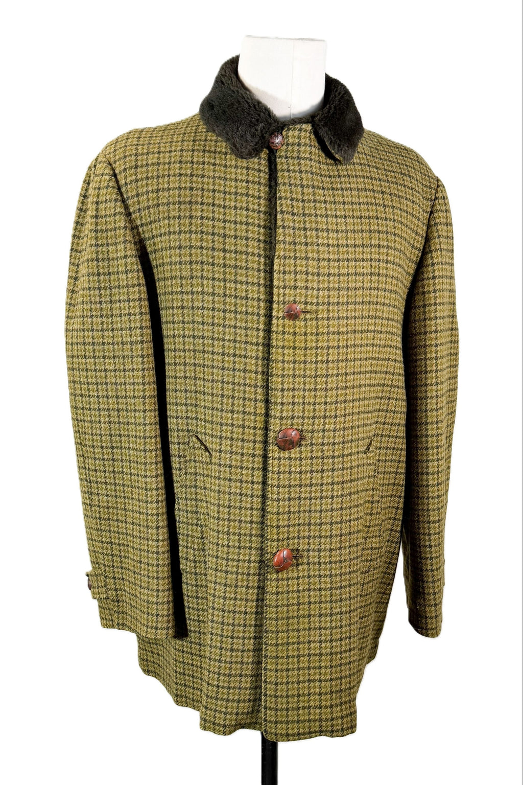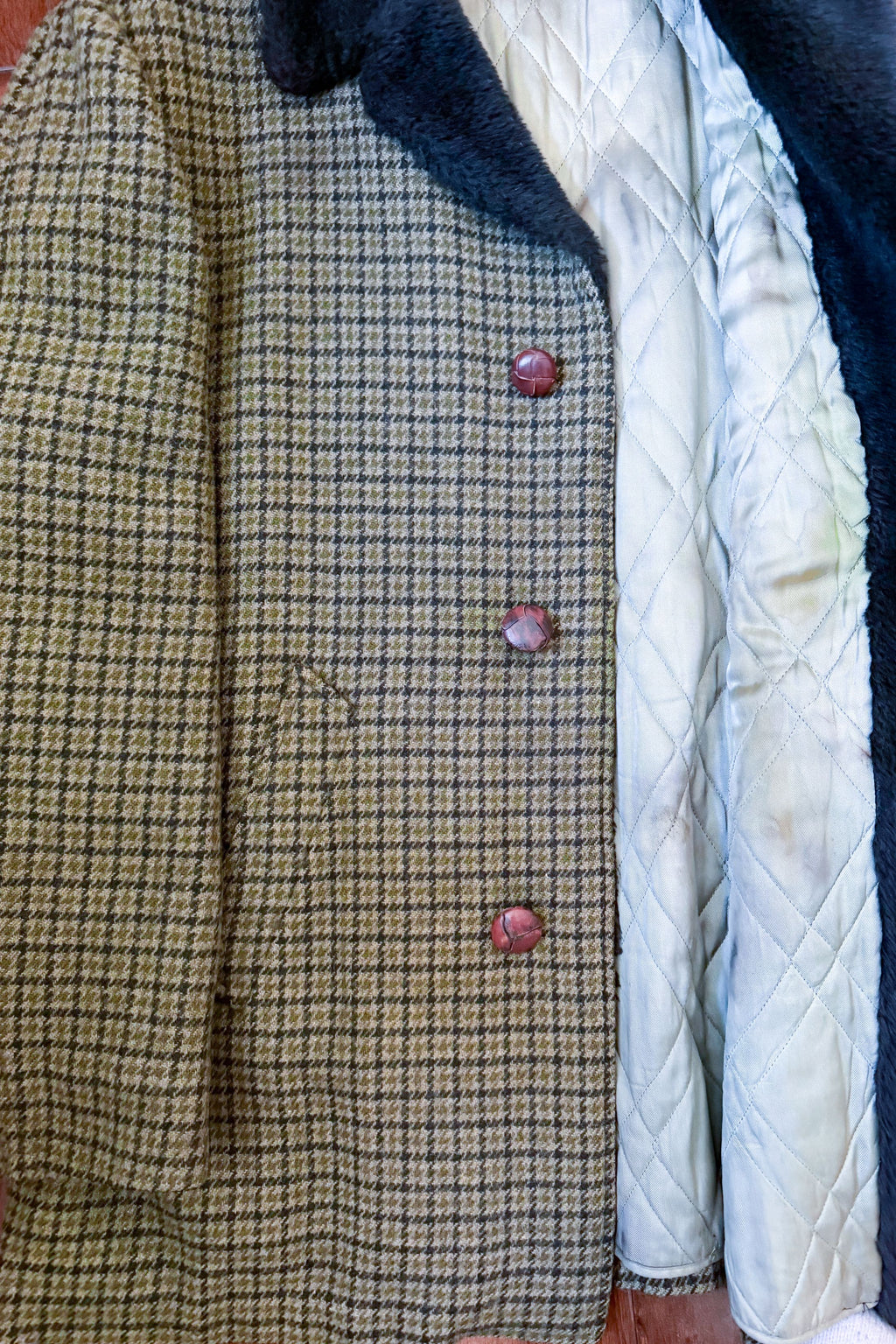 Condition: Very good preowned vintage. Has been professionally dry cleaned. The top button has been replaced, it is a little bit smaller than the others. The lining has spots that did not come out in the dry cleaning.