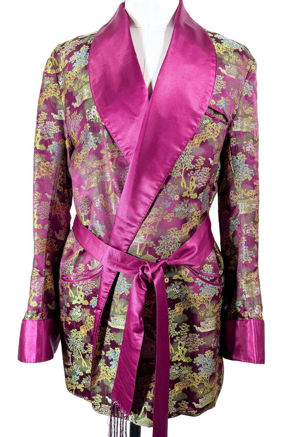 Vintage Mens Silk Smoking Jacket, Chinese Pattern Shawl Collar + Belt