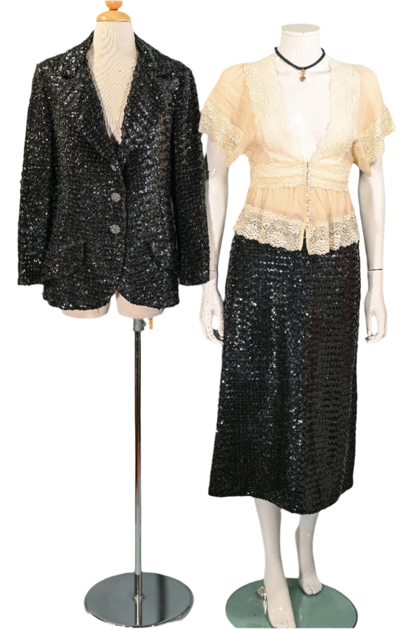 Vintage 60s Black Sequin Jacket/Skirt 2 Piece Suit, Eveningwear Party Separates Suit