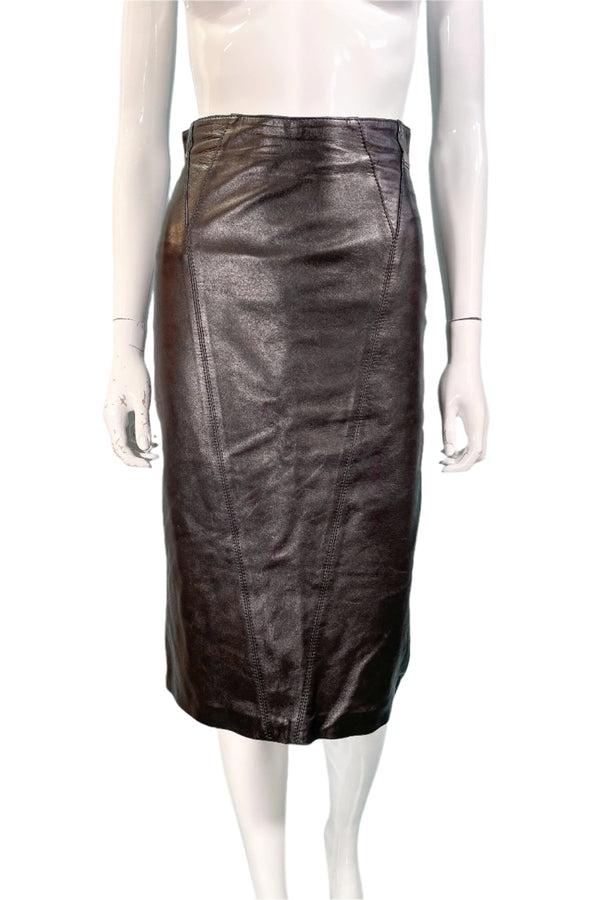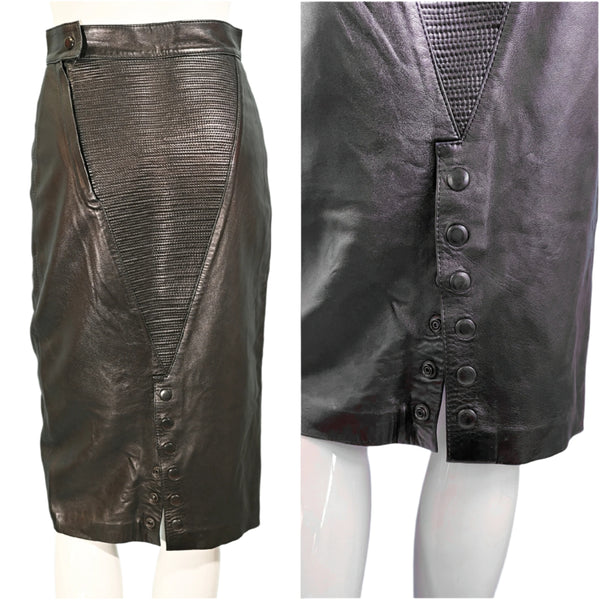 Vintage 80s Black Leather Fitted Pencil Skirt, Great Details S