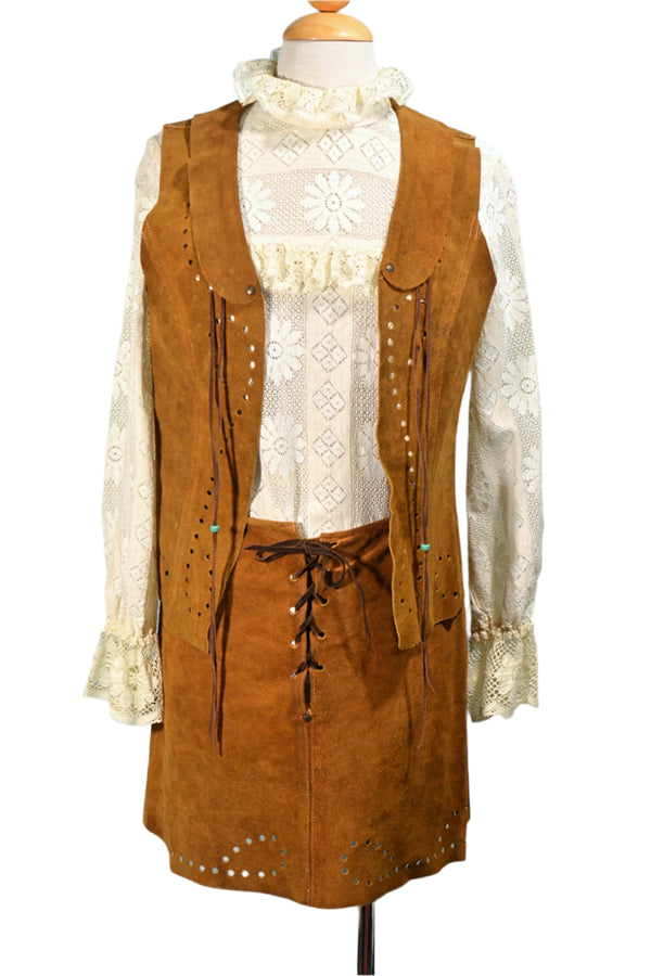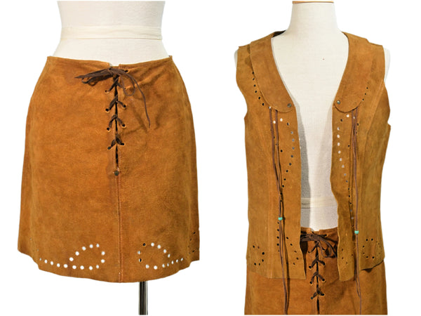 60s Suede Lace Up Skirt & Matching Vest with Beads, Hippie Boho 2 Piece Set