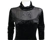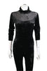Stretchy black crushed velvet, mesh inset neckline, mock turtleneck.