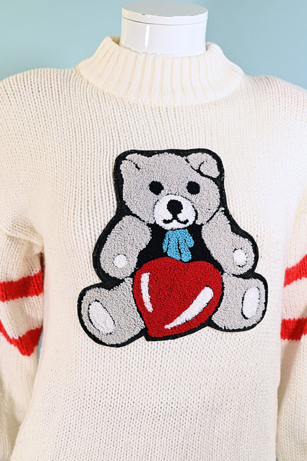 Vintage White Sweater Bear/Heart Patch, Acrylic Novelty Pullover Sweater