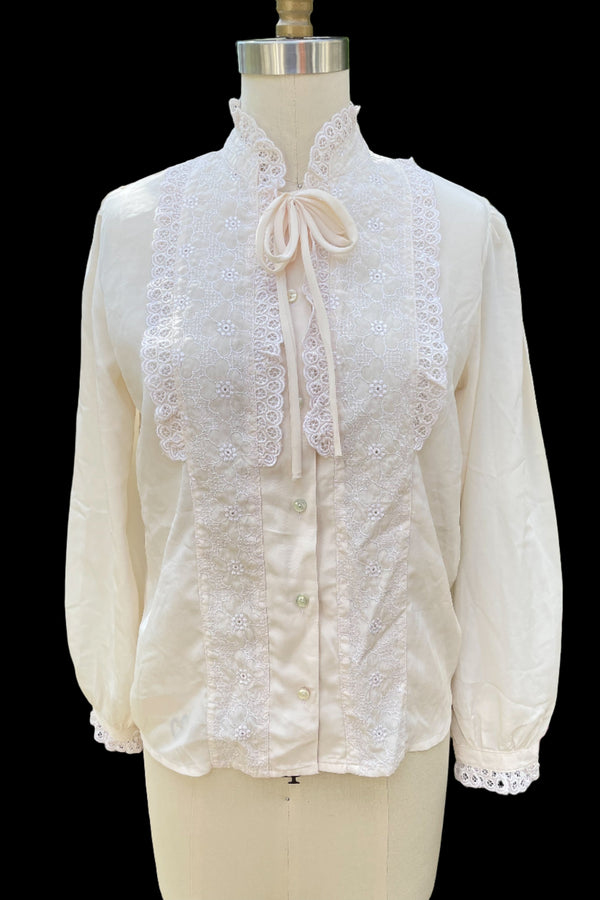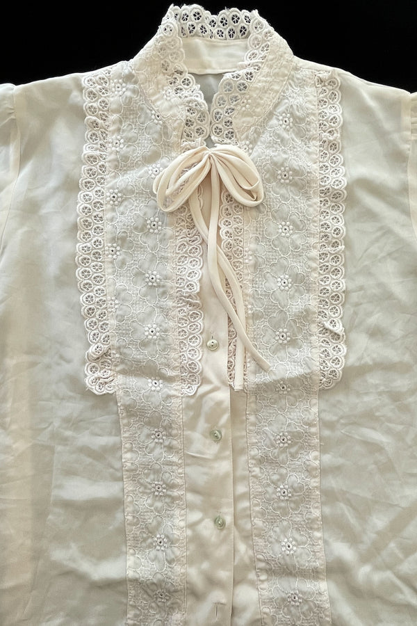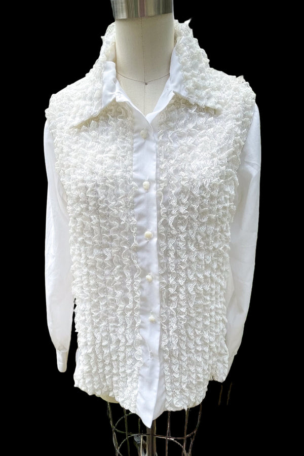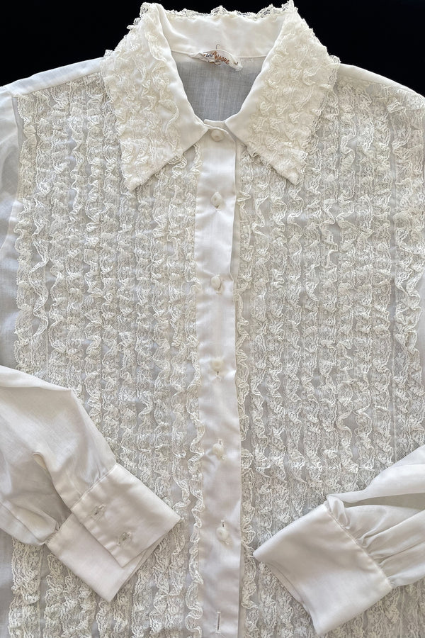 Vintage 70s White Lace Blouse Tunic, Tuxedo Style Ruffle Blouse Lady Arrow