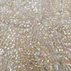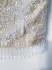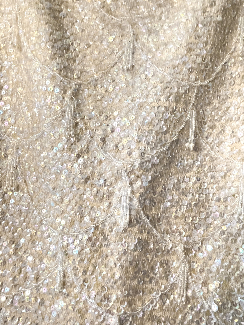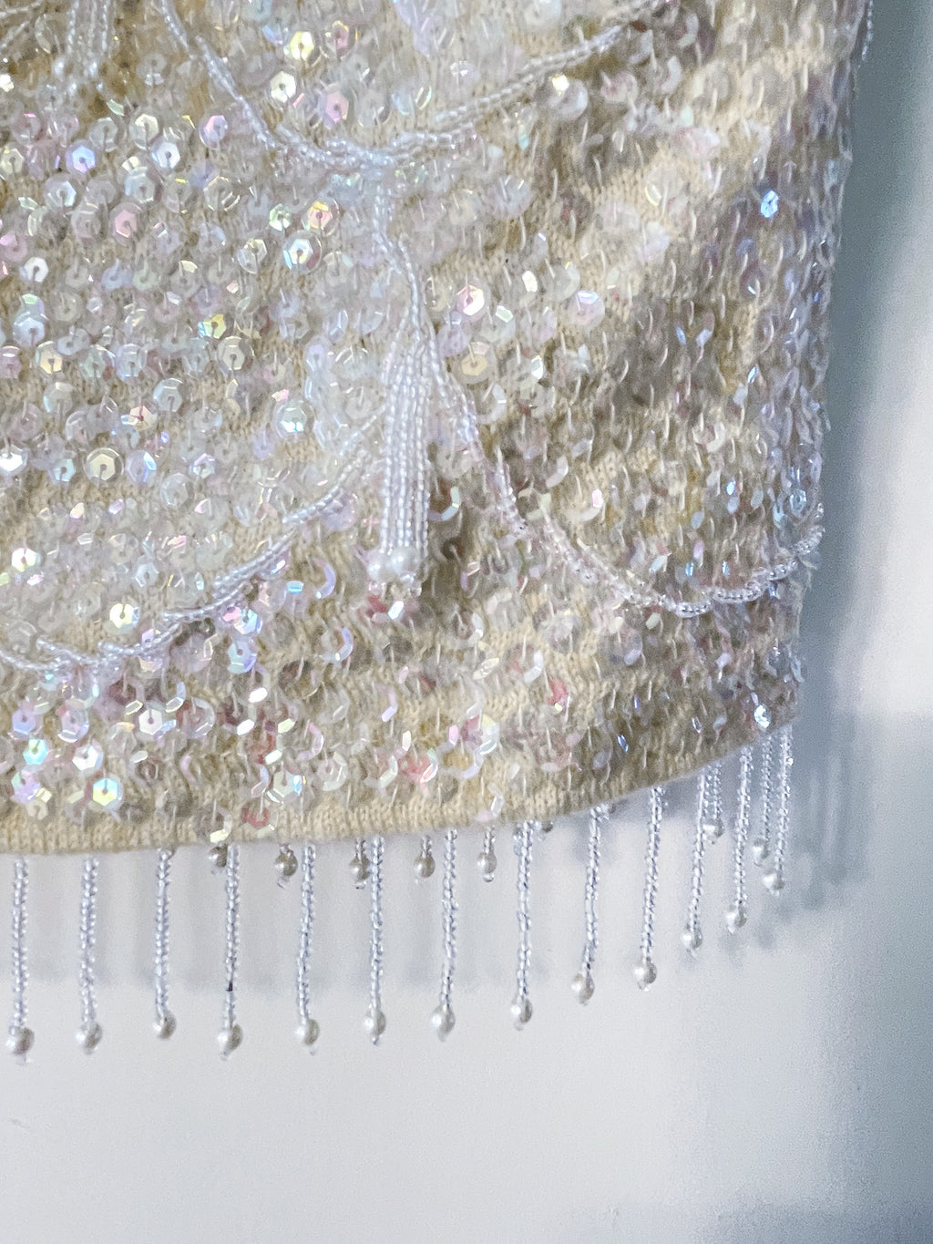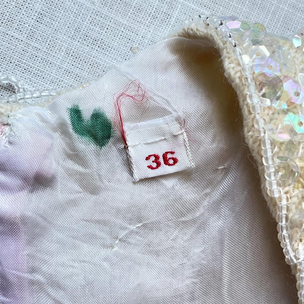 Off white/cream color wool sweater ground, clear iridescent sequins, glass beads & faux pearls.