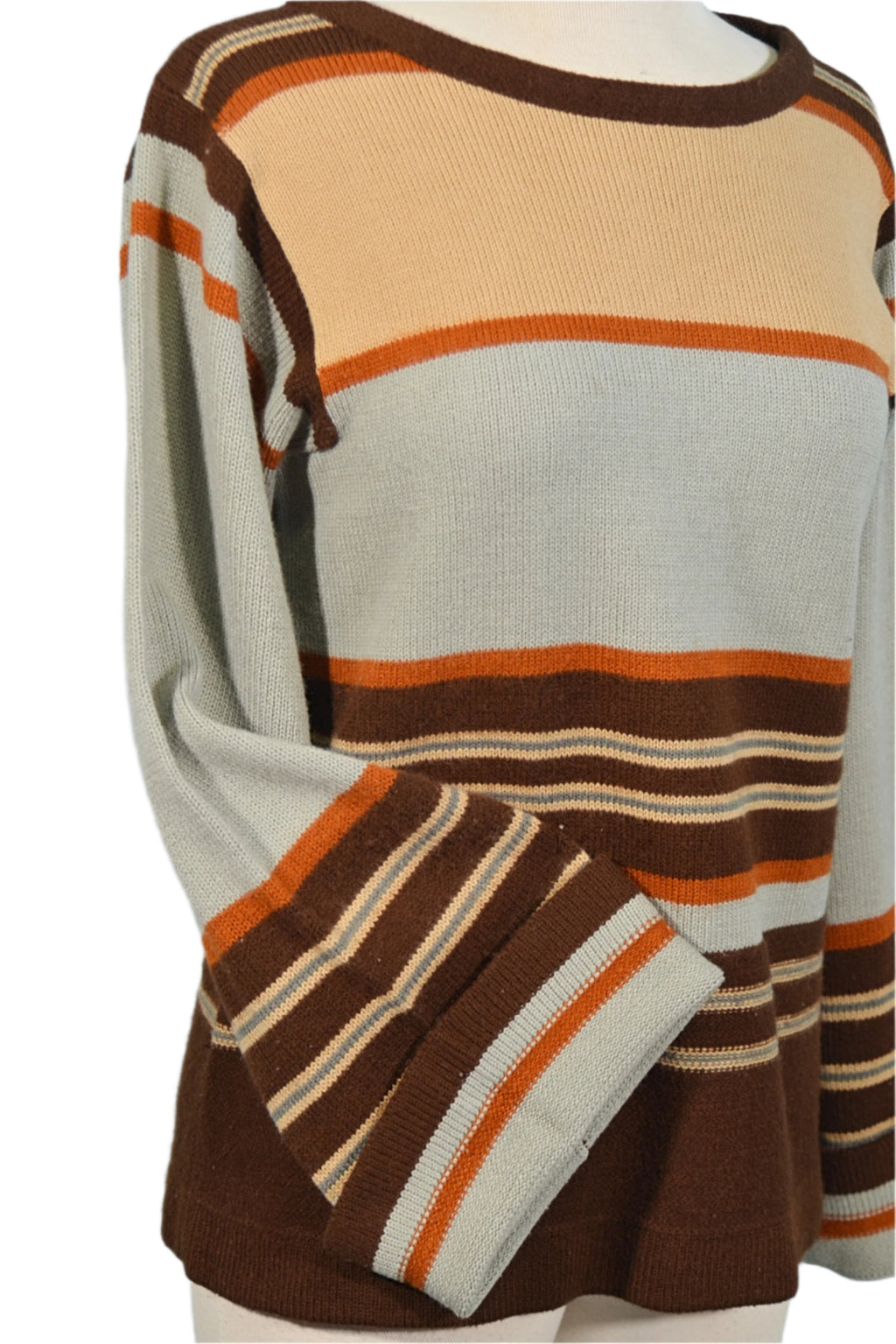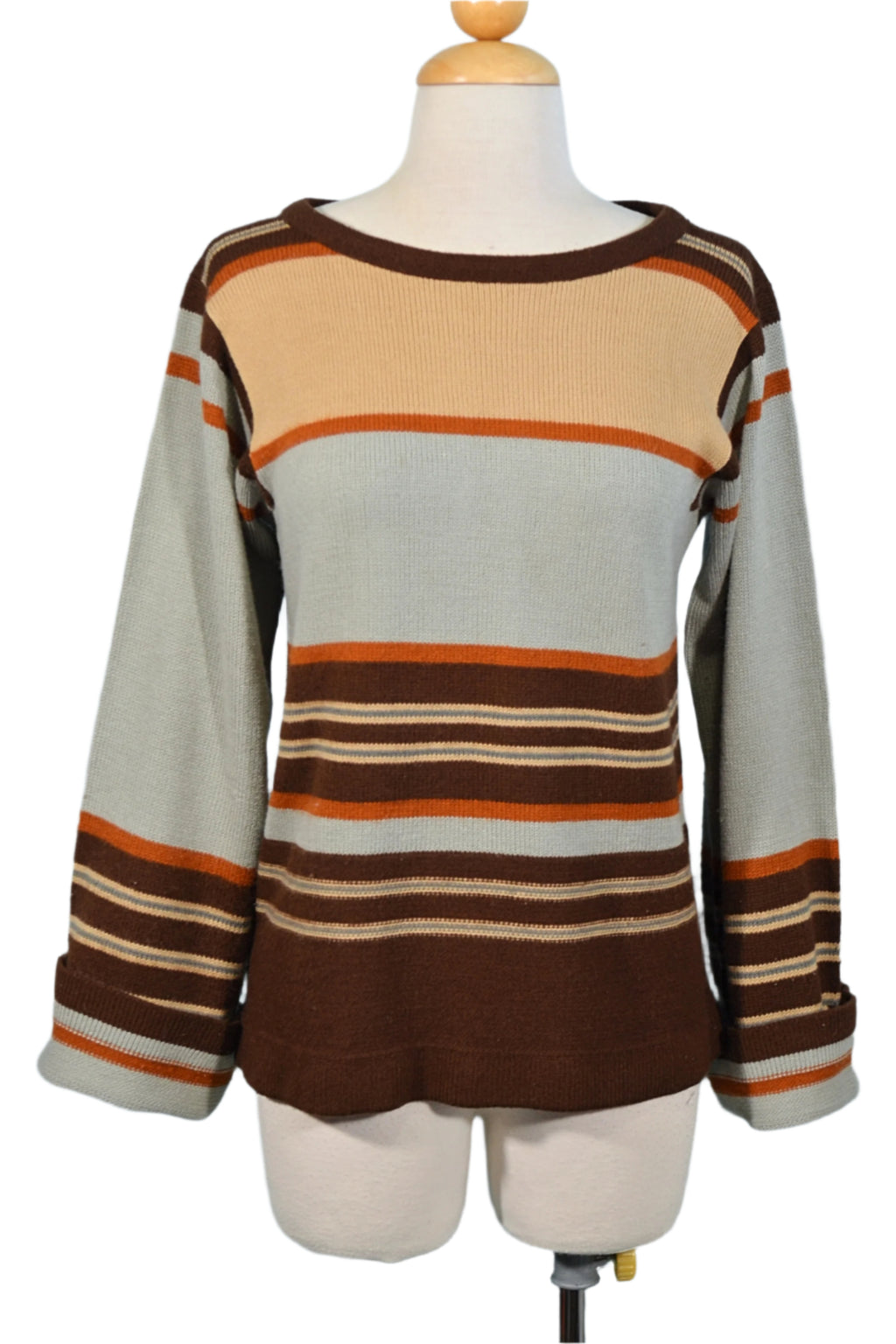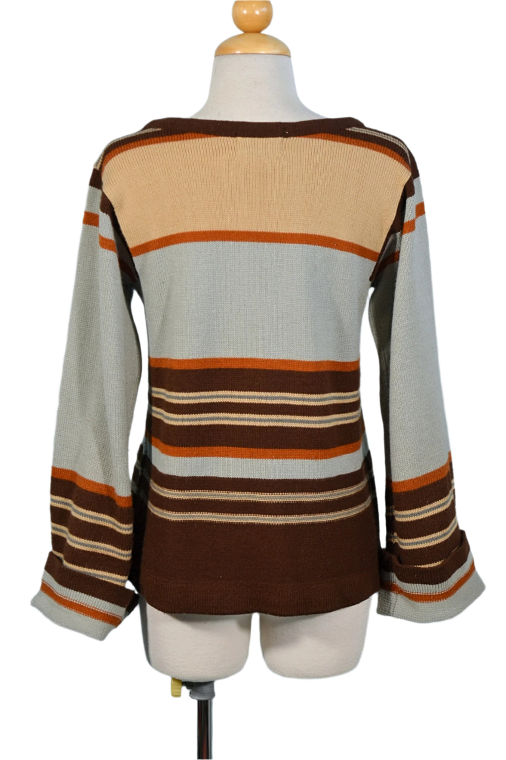 Striped pattern, Acrylic knit, blue-grey, tan, brown, rust.