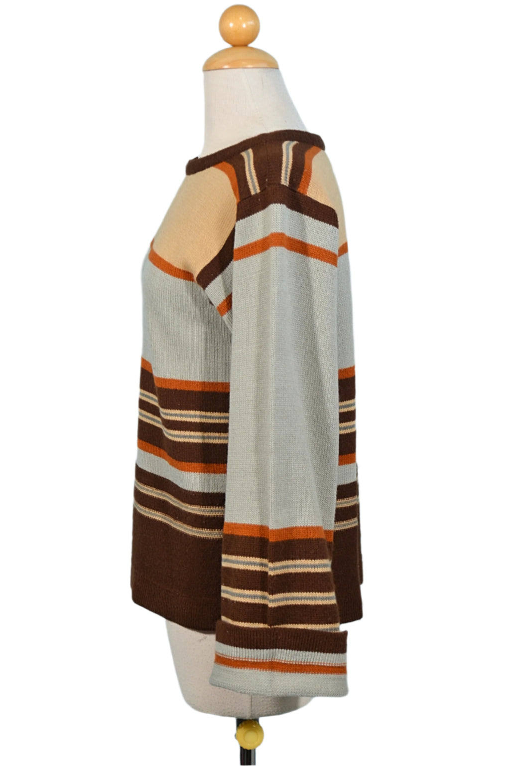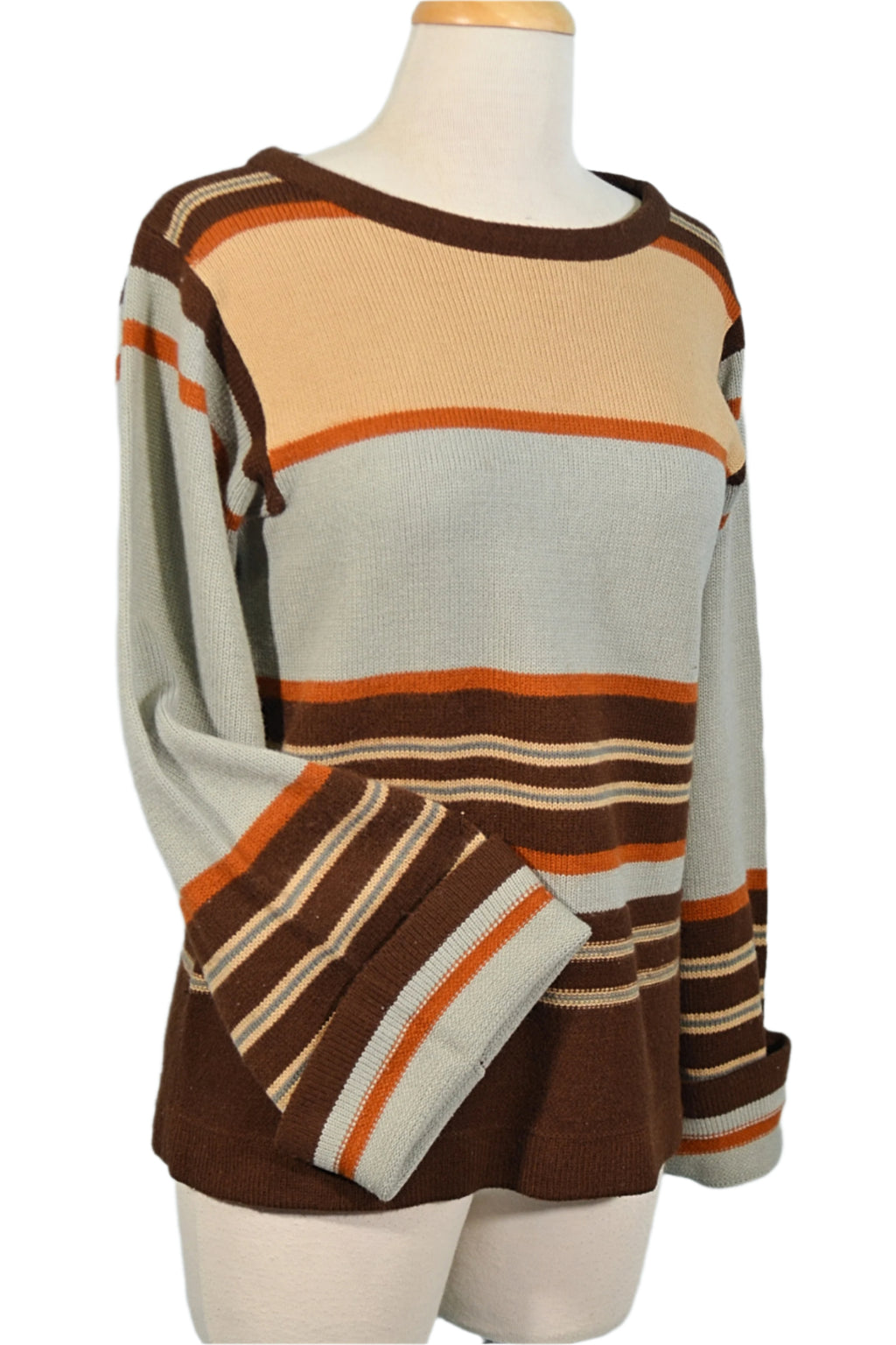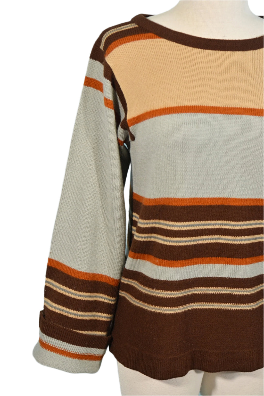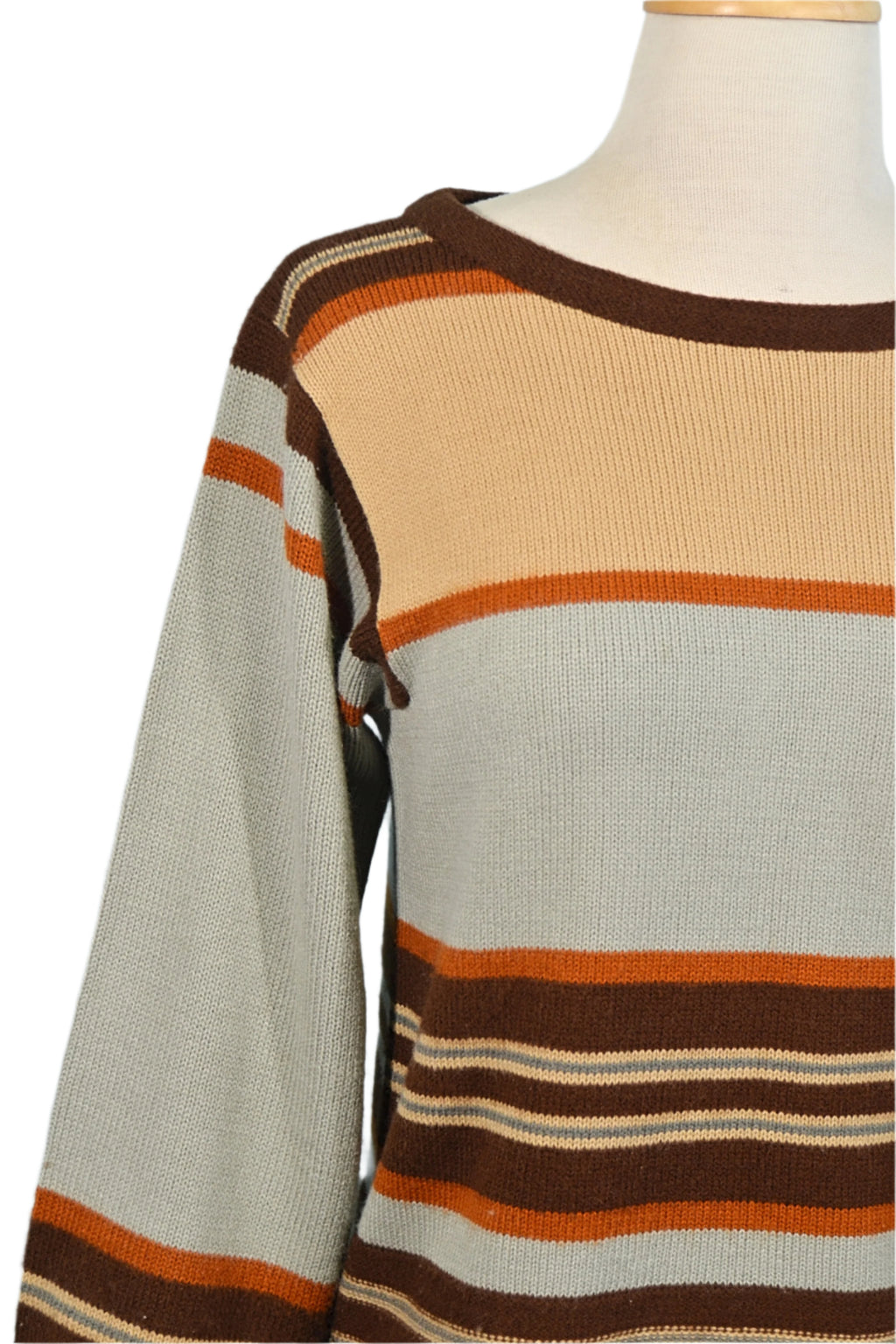 Striped pattern, Acrylic knit, blue-grey, tan, brown, rust.