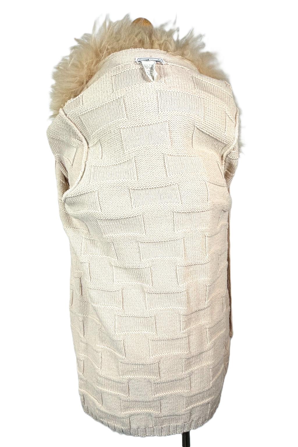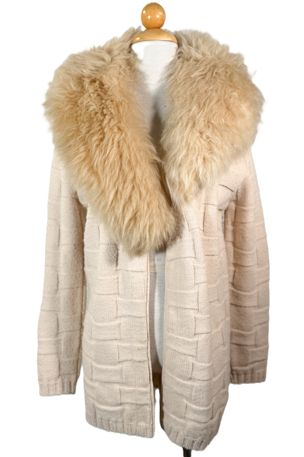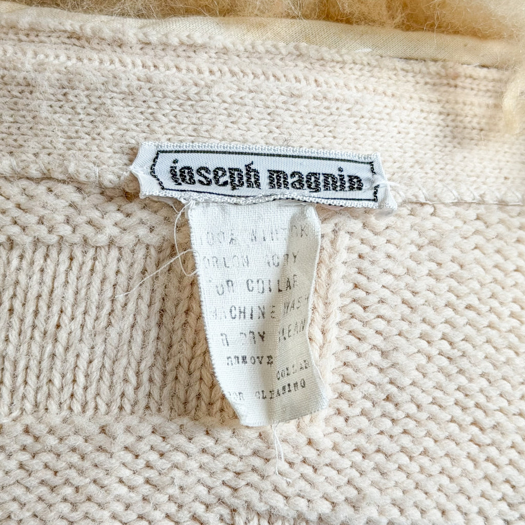 Removable genuine fur collar. Hand stitched onto the sweater. Remove to clean or wash.