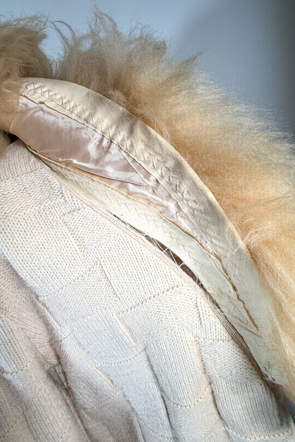 Material: Orlon (acrylic) knit, genuine shearling sheepskin collar.