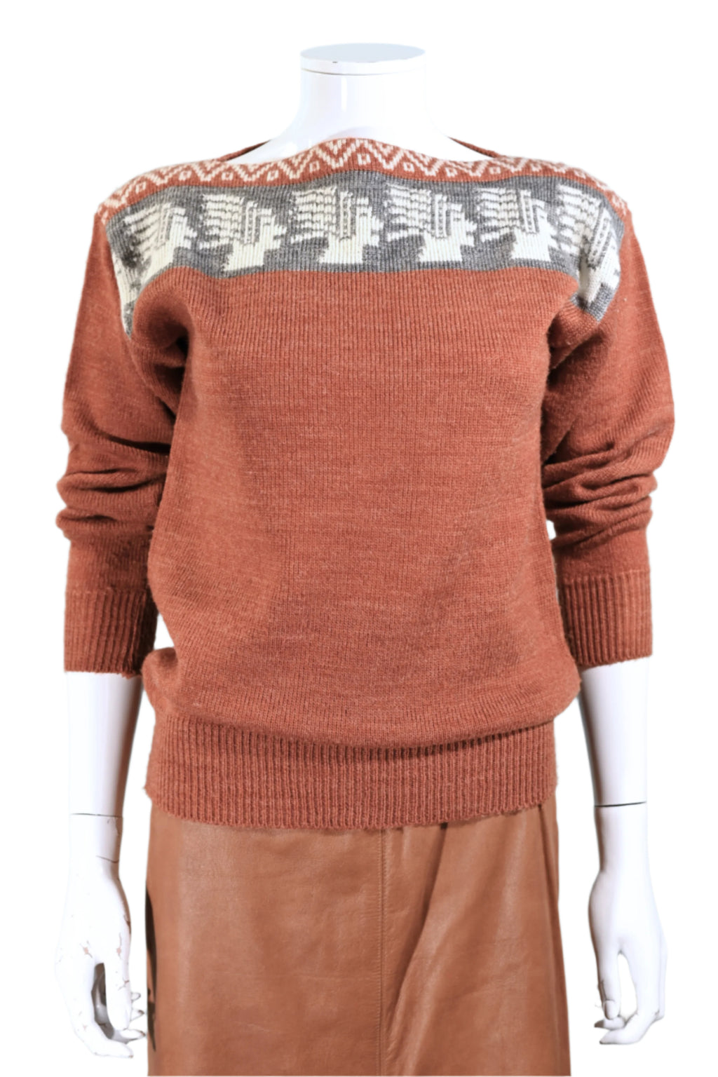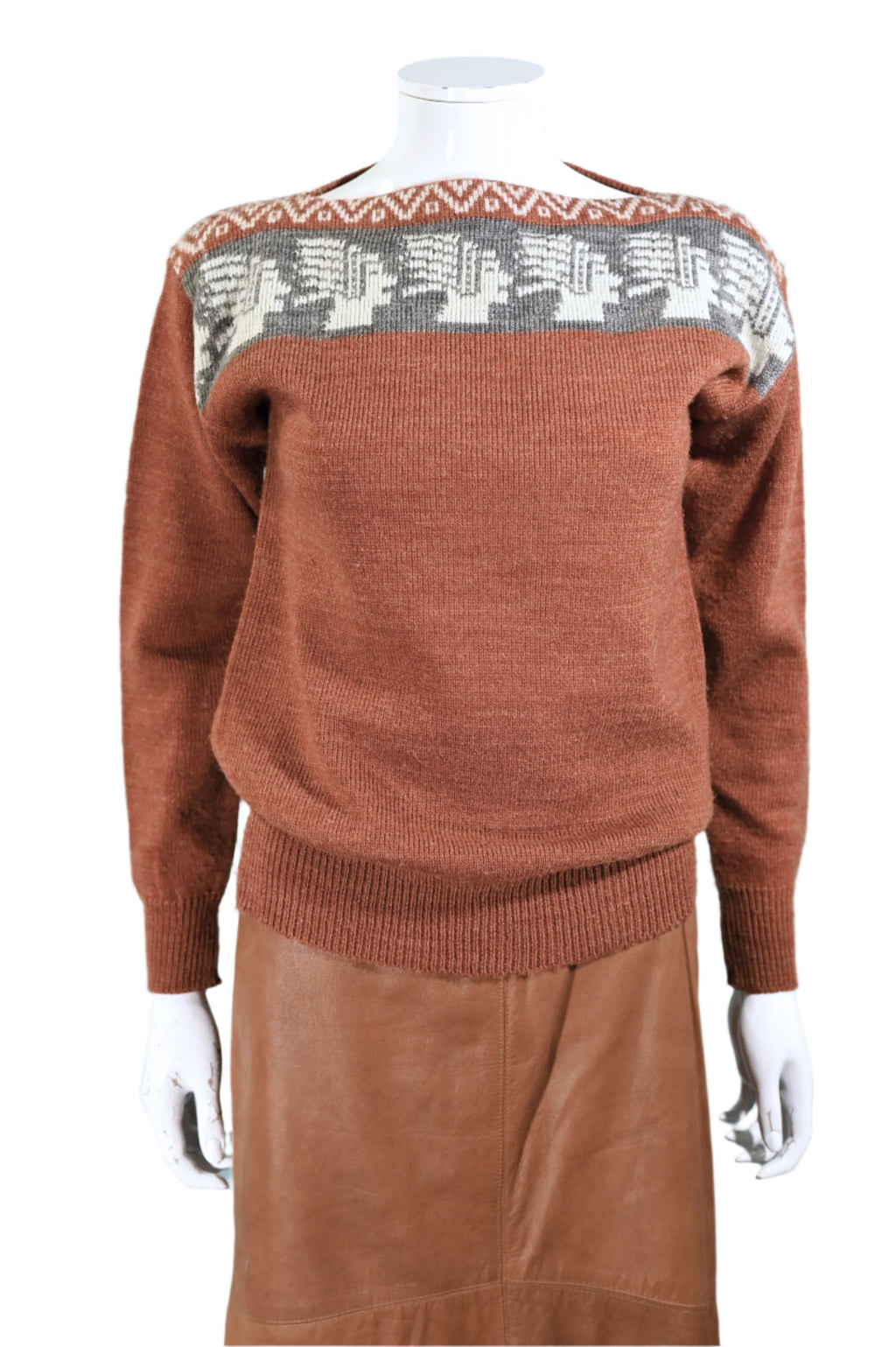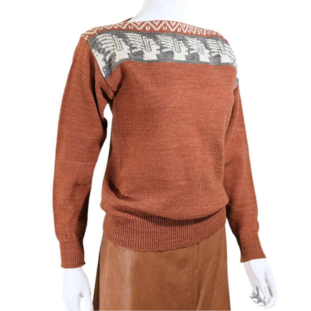 Vintage 70s pullover sweater with tribal/ethnic pattern on the neckline.