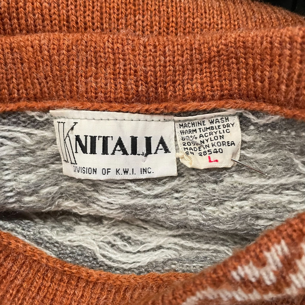 Rust, cream, gray colors. Acrylic yarn, Intarsia details.