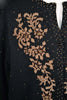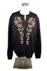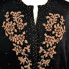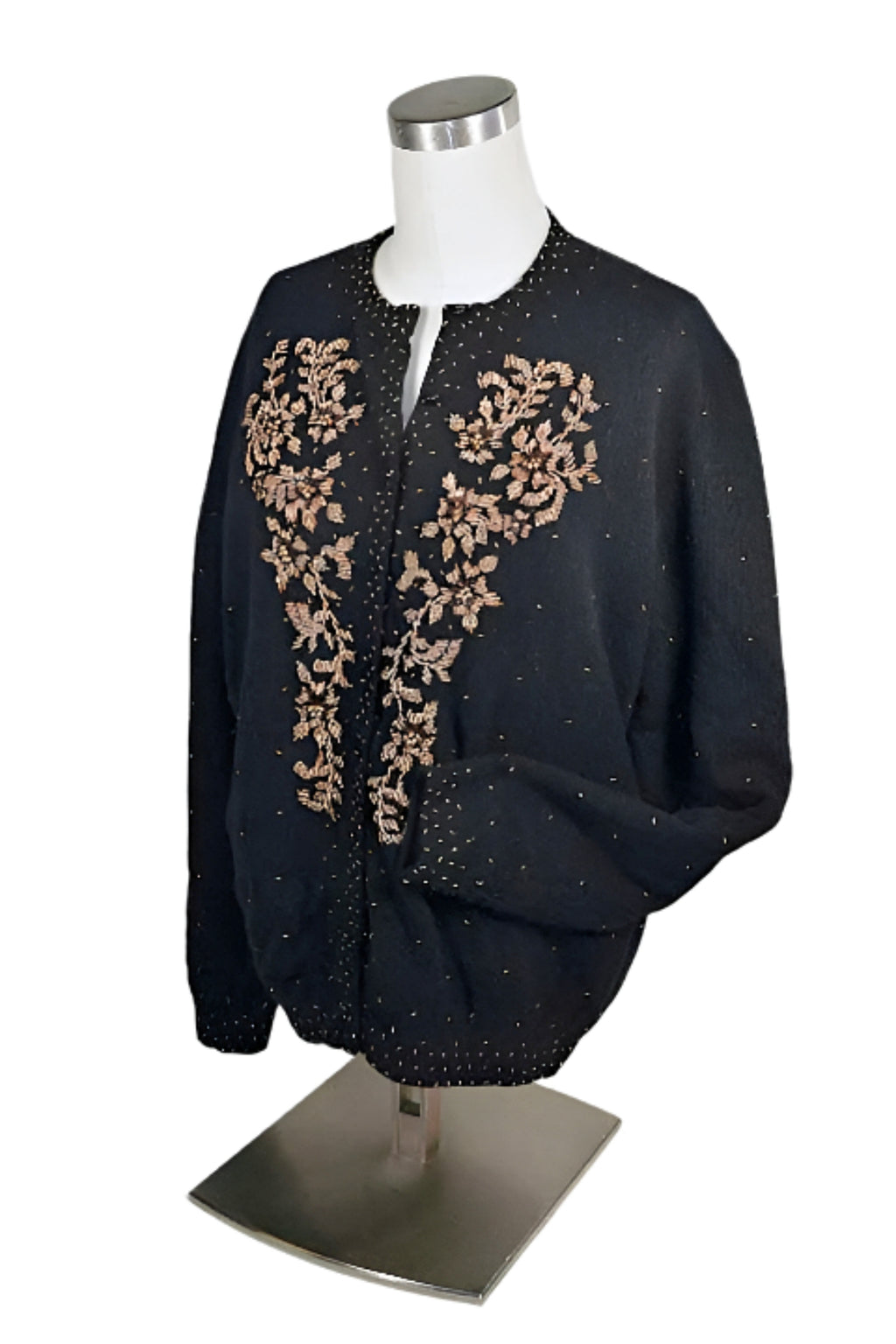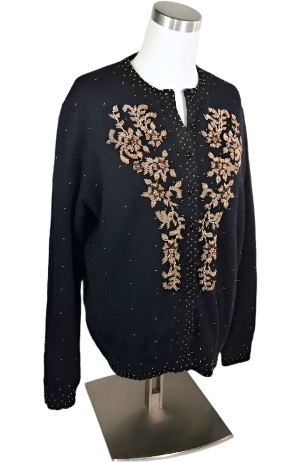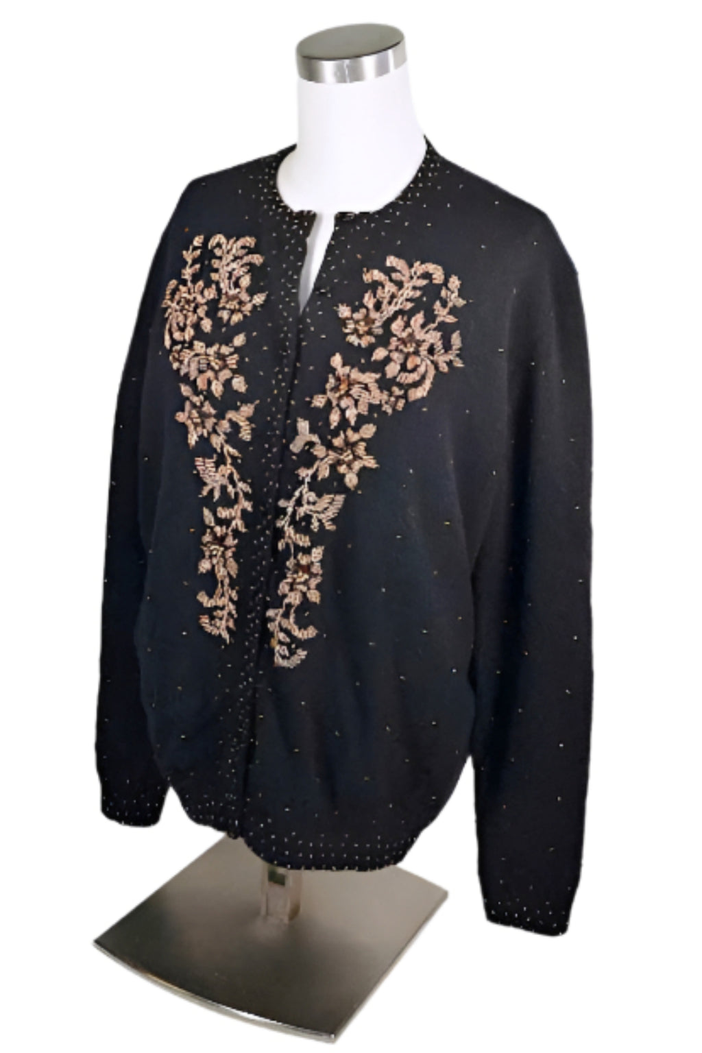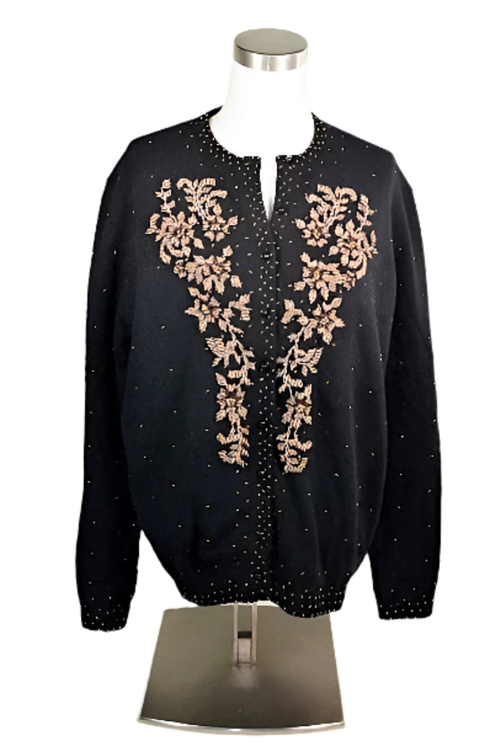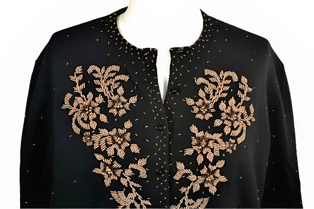 Beautiful black wool evening sweater accented with bronze and gold beads.
