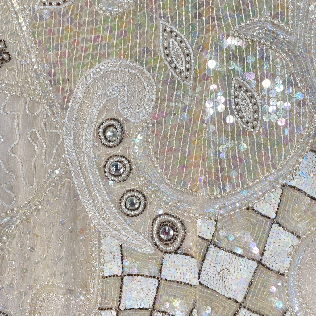 Cream and white, beads, sequins, & large jewels, top stitched, heavily detailed.