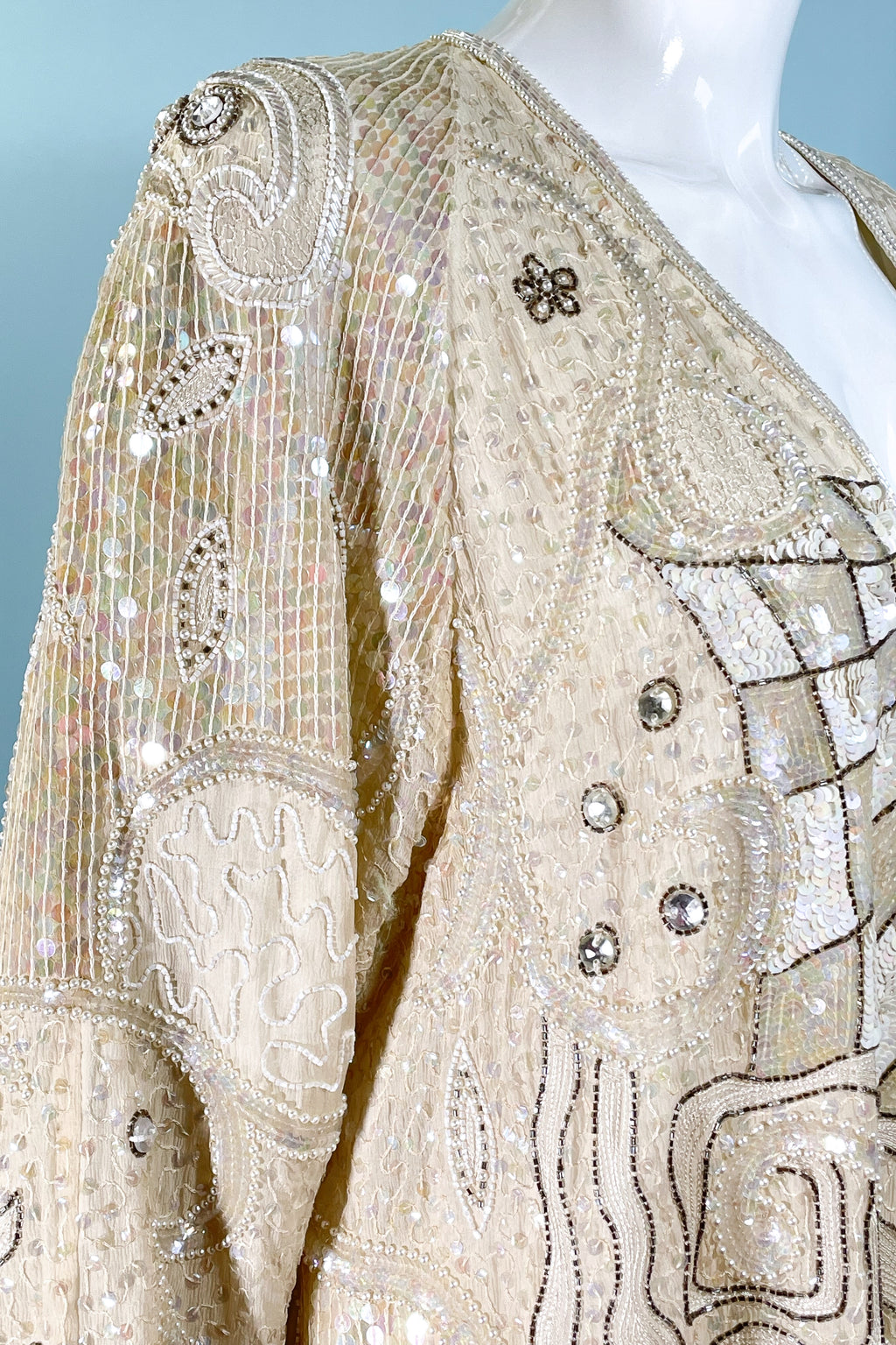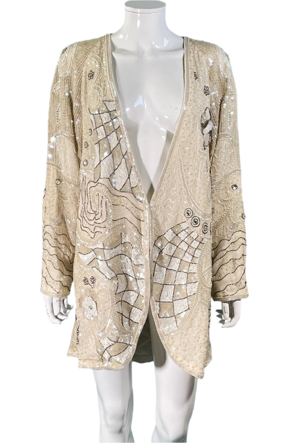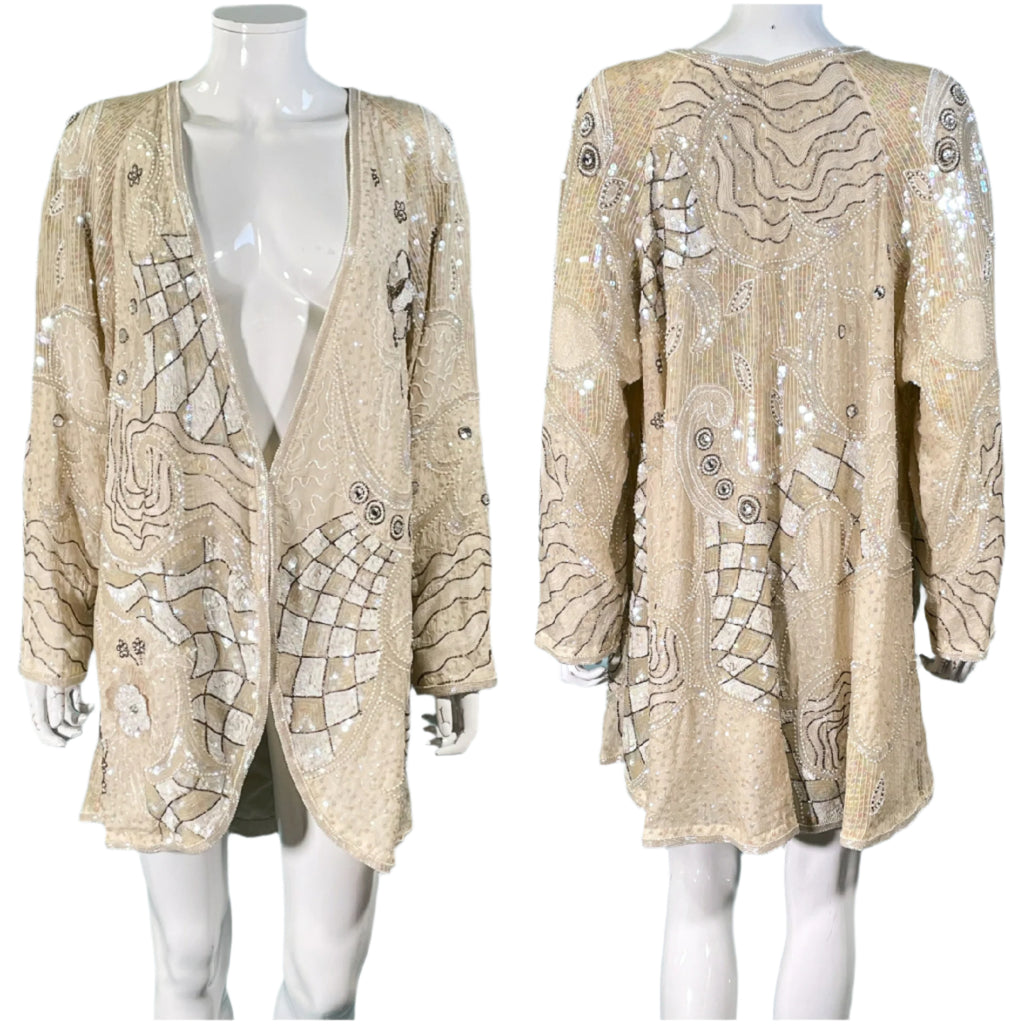 Vintage Cream/White Beaded Sequin Bejeweled Cocoon Top/Jacket, Oversized Fit M-XXL