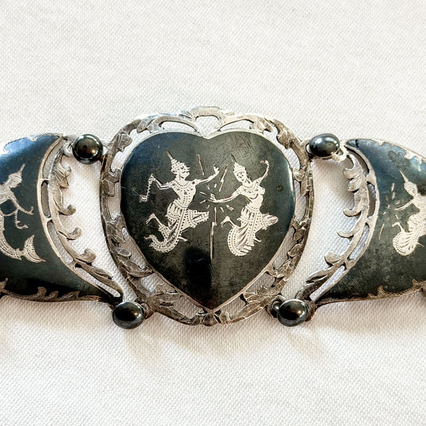 Vintage Siam Dancers Sterling Silver Bracelet, Heart Shaped 7.25L