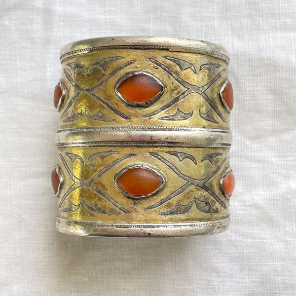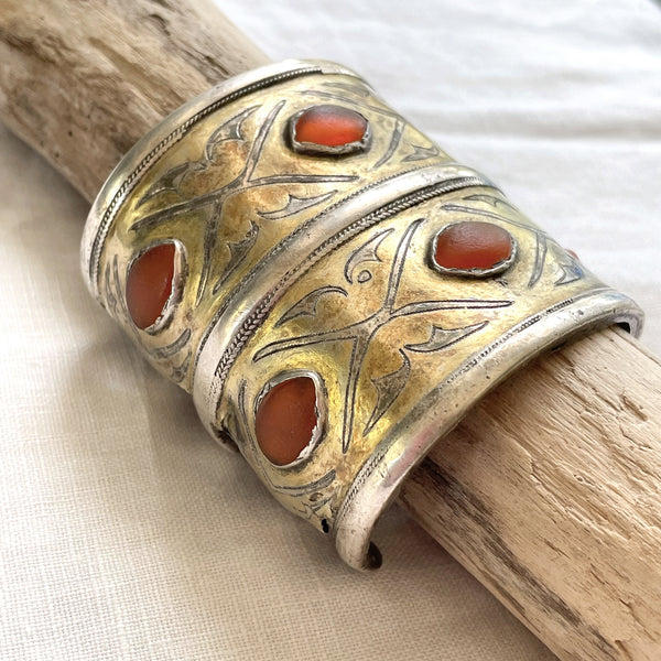 Vintage Turkoman Carnelian Silver/Gilt Bracelet, Bohemian Ethnic Cuff, Small Wrist 6 1/8"