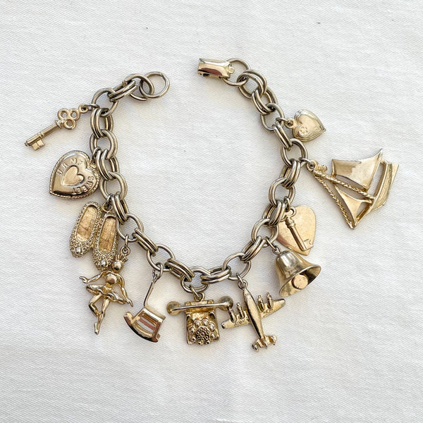 SOLD Vintage Coro Gold Tone Charm Bracelet, Dancer Boat, Hearts + More 7 1/2" L