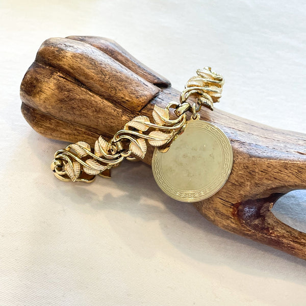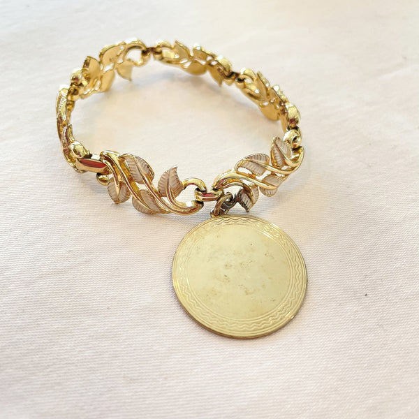 SOLD Vintage Coro Enamel Leaf Charm Bracelet, Etched Disc Charm 7 1/4" L