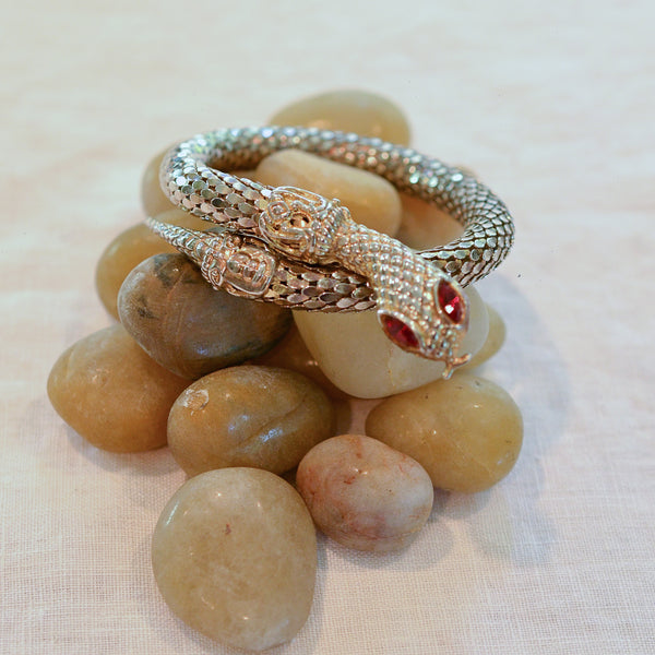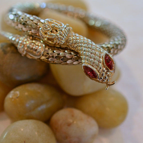 Vintage 70s Gold Tone Snake Coil Bracelet, Red Eyes M