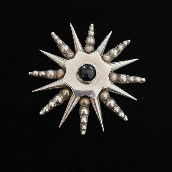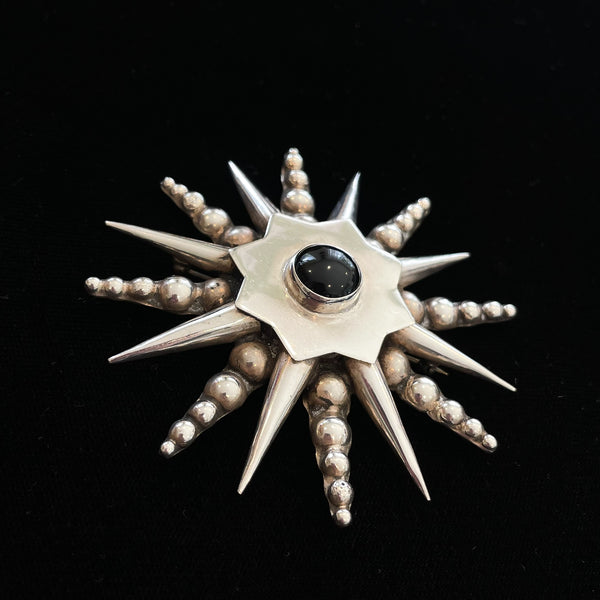Vintage 925 Silver Onyx Starburst Atomic Brooch 3" Dia, 3.7 G