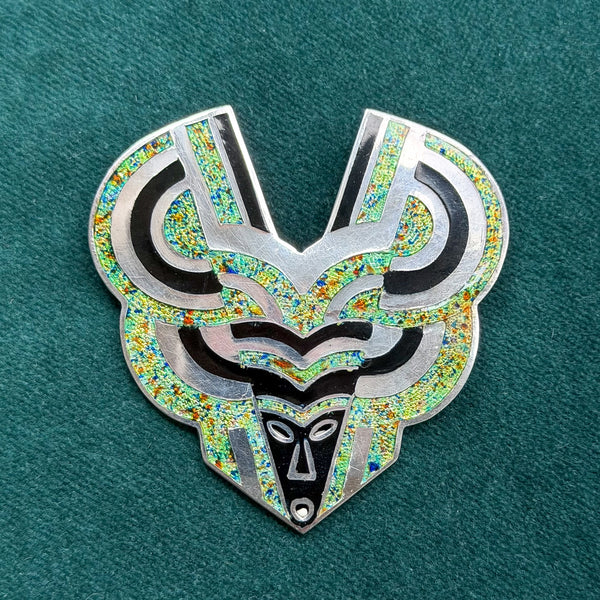 Vintage Margot De Taxco Sterling Enamel Brooch, #5414A Mask/Pointed Face Book Piece
