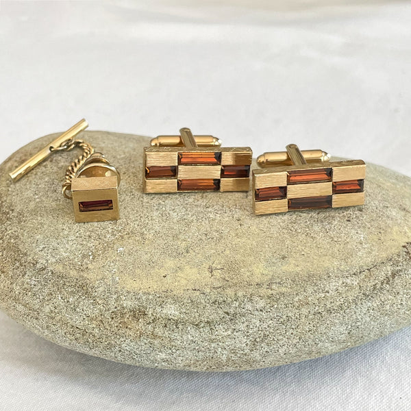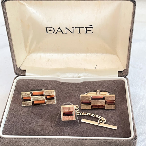 Vintage Dante Modernist Cufflinks Tie Pin Set in Box, Gold Tone & Topaz Glass Stones Unworn