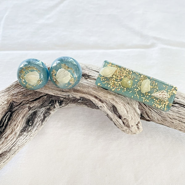 MCM Confetti Lucite Seashell Tie Bar Cufflink 3 Piece Set