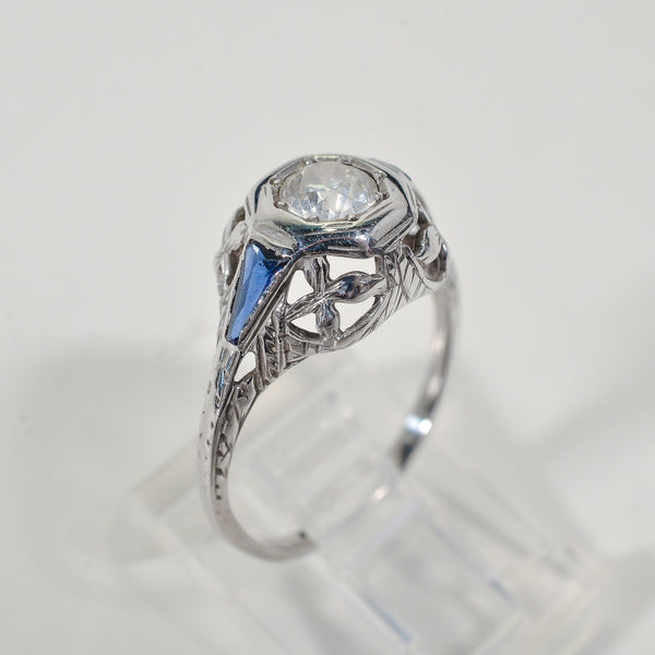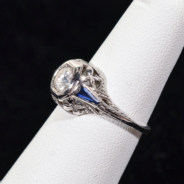 Antique 1920s Art Deco/Nouveau Old Cut Diamond 14K White Gold Ring, Synthetic Blue Sapphire Baguettes, Engagement Wedding Bridal Ring SZ 5.5