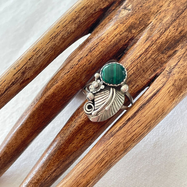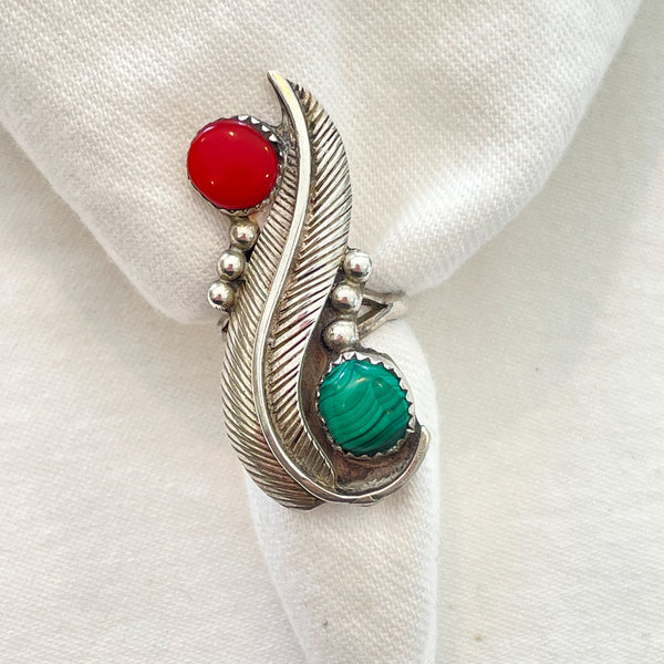Vintage Sterling Southwestern Malachite/Coral Leaf Statement Ring SZ 6 1/2