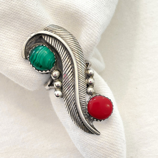Vintage Navajo Silver Malachite Coral Native American Ring, Southwestern Statement Ring Size 7 1/4