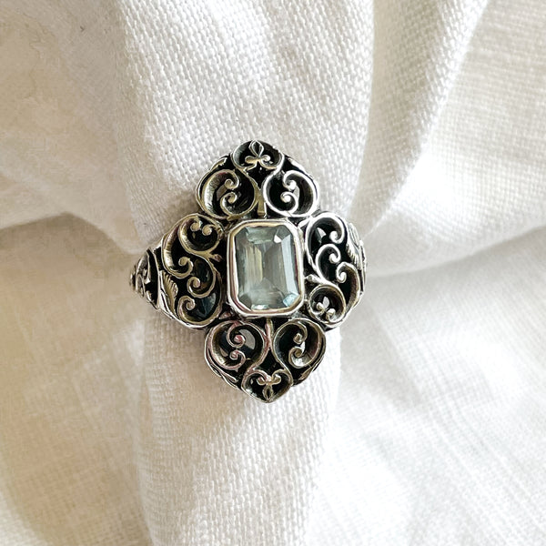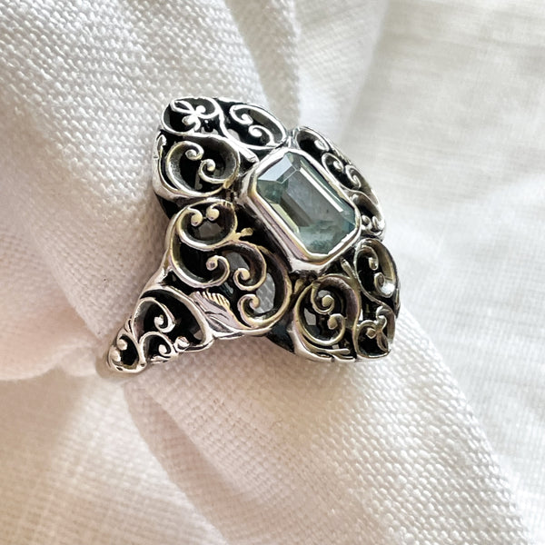 Vintage Sterling Silver Blue Topaz Filigree Ring, Thailand SZ 6.5