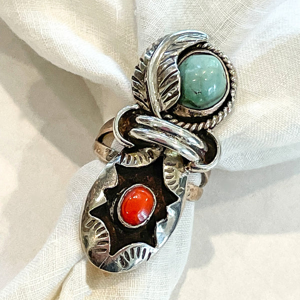 Vintage Native American Navajo Ring, Silver Turquoise Coral SZ 7