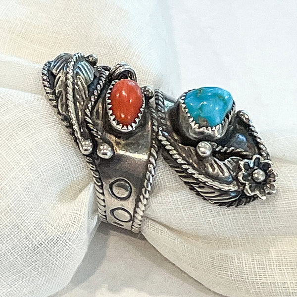 Vintage Navajo Silver Turquoise/Coral Leaf Ring Size 7