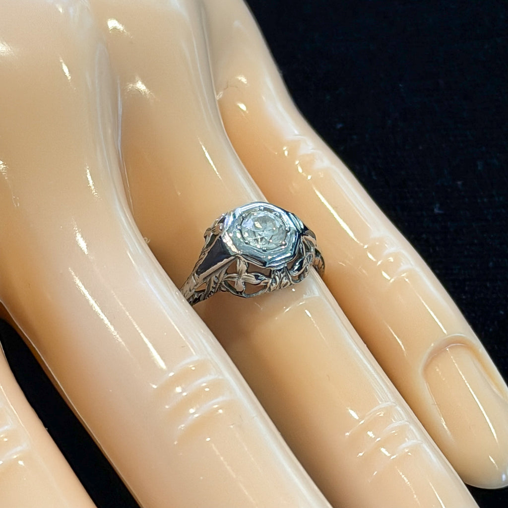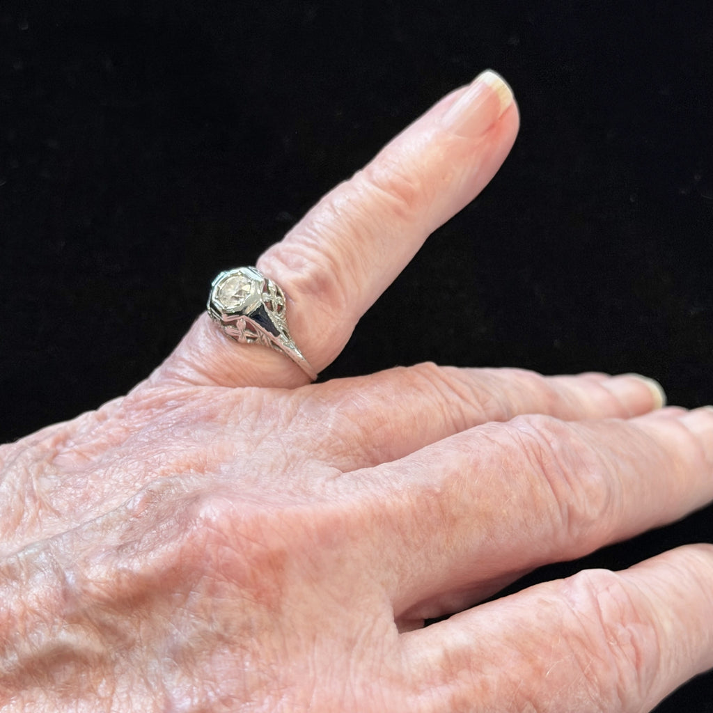 One old cut diamond is eight-prong set low into a 1920's Art Nouveau style dome ring.