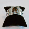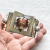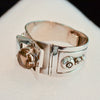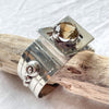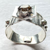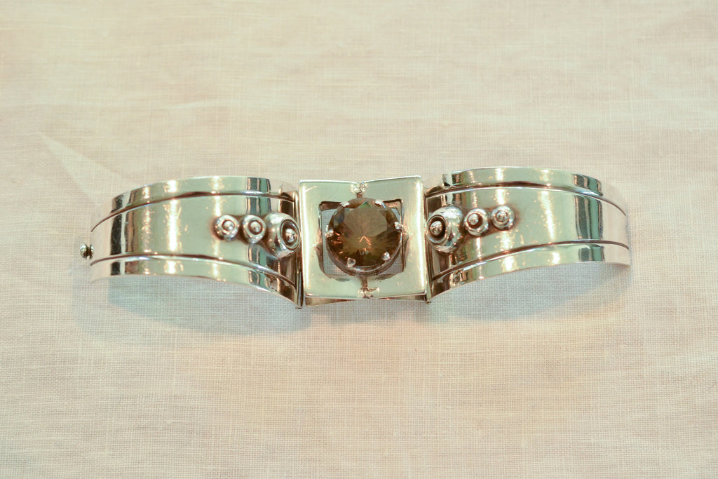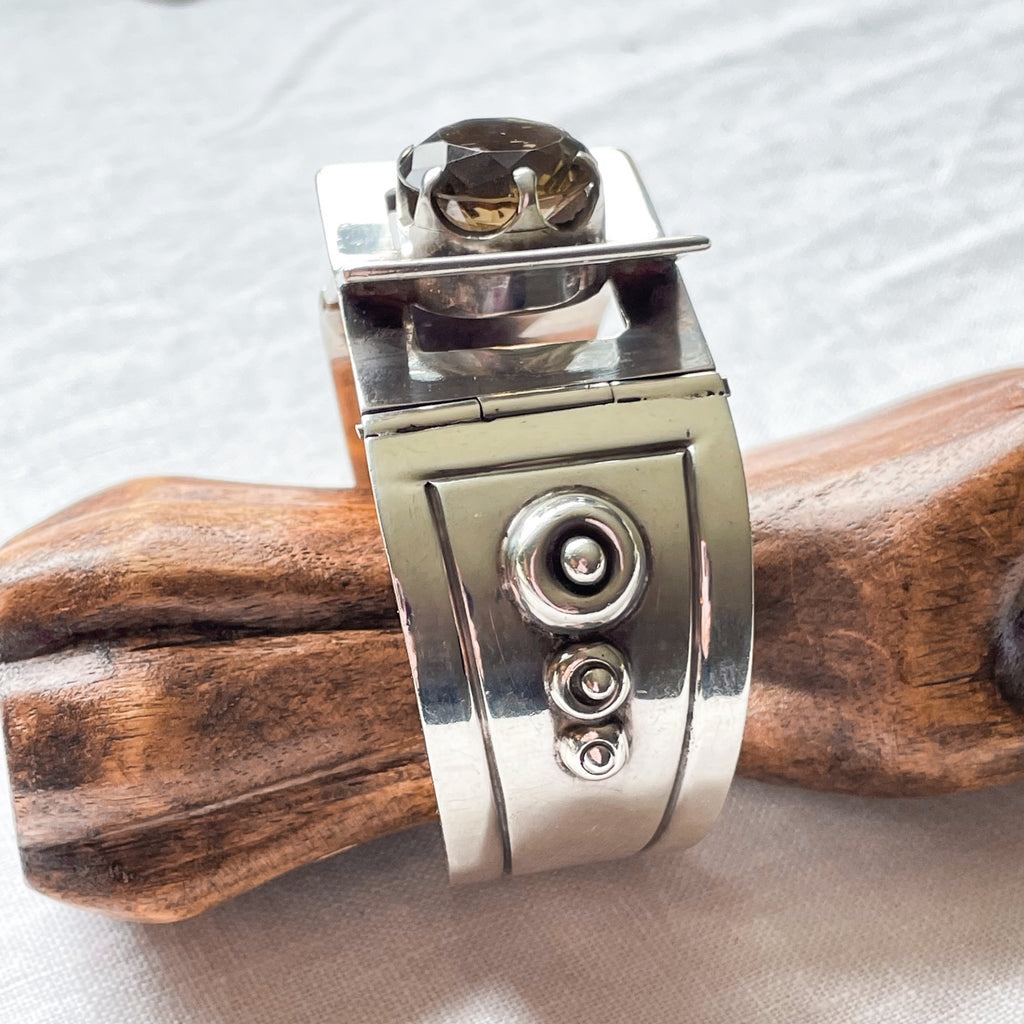 Raised panel with a large, faceted prong set smoky topaz, raised circles on the side panels.