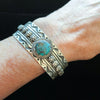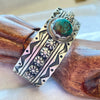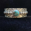 Round Bisbee Turquoise stone in the center, bezel set with rope details.