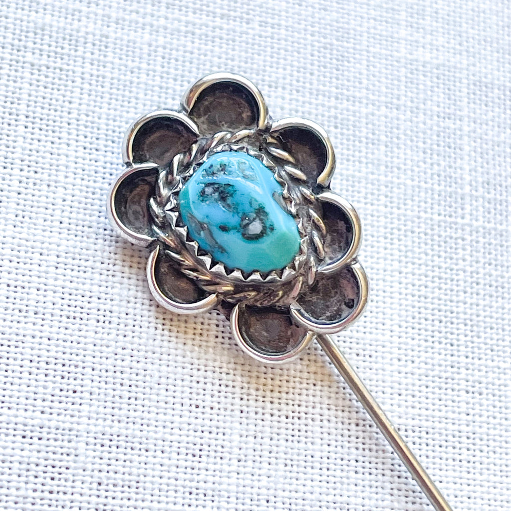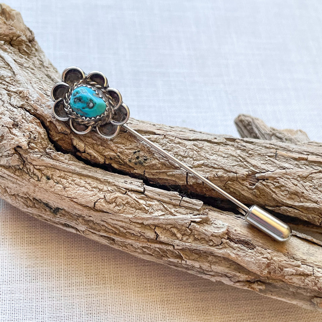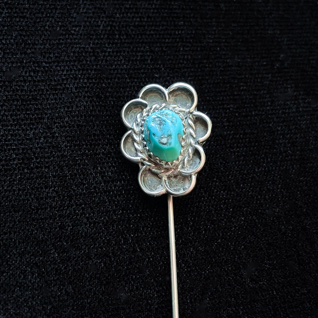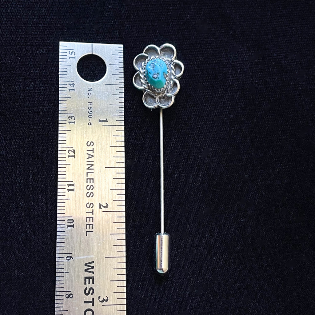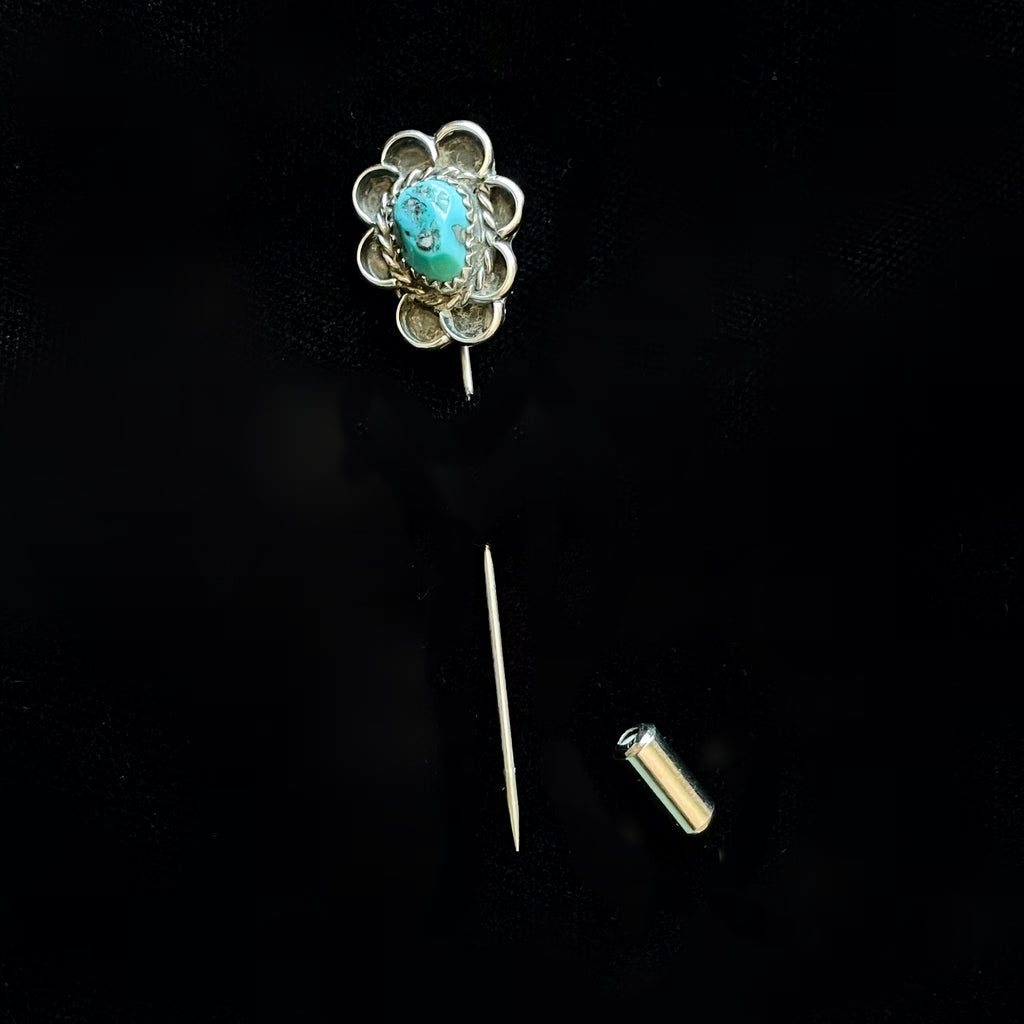 Nice southwestern stick pin with scalloped edges, turquoise nugget stone and sawtooth bezel setting.