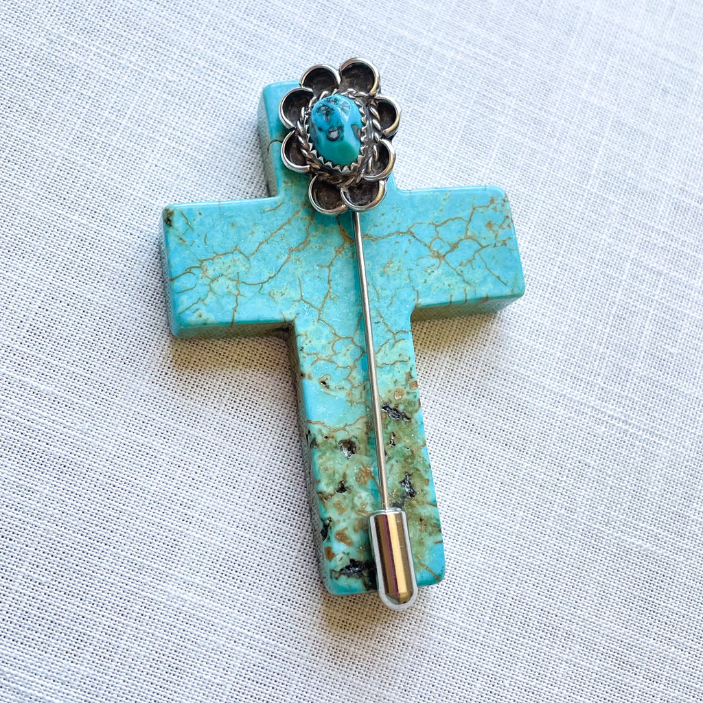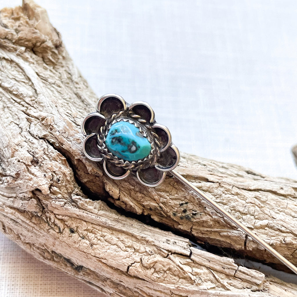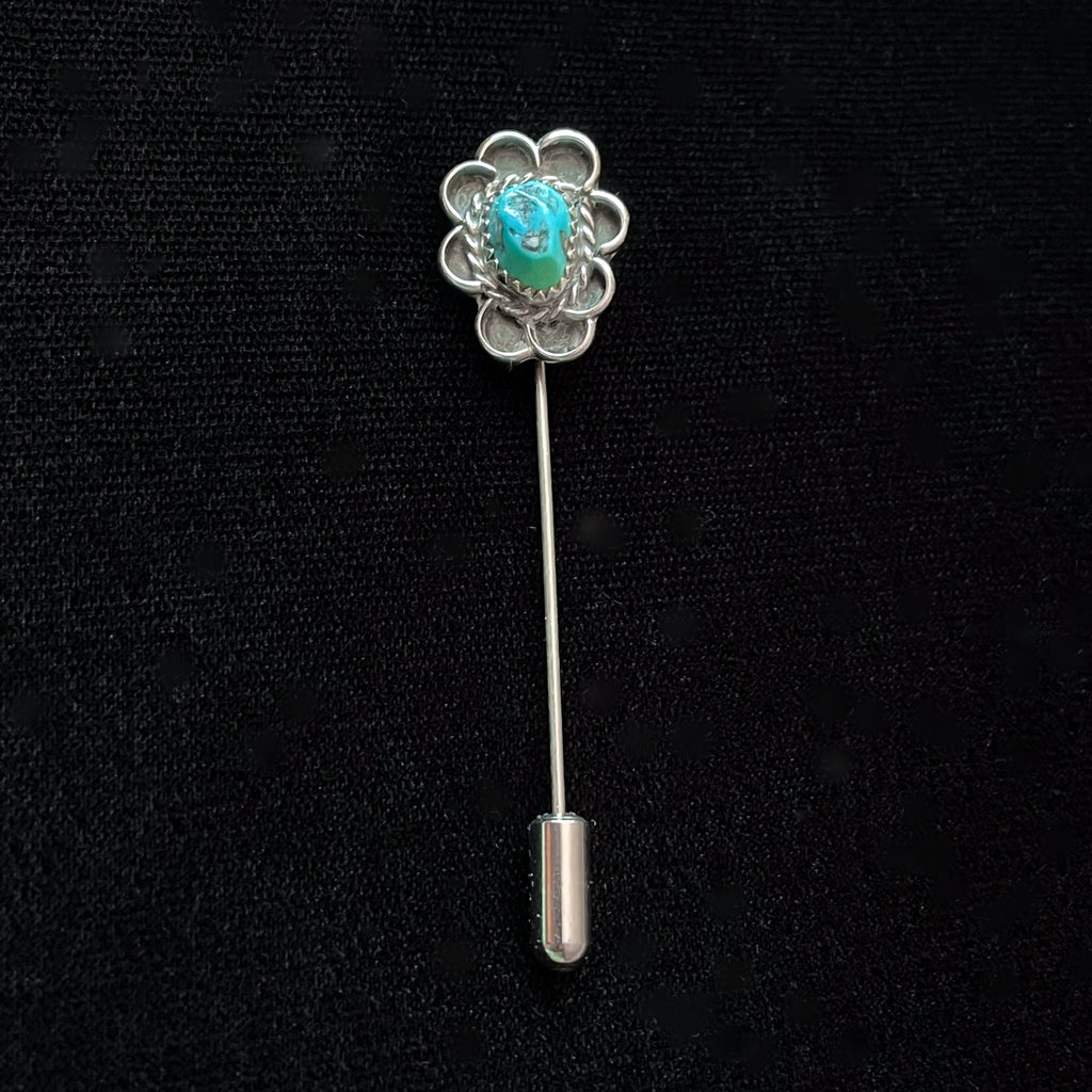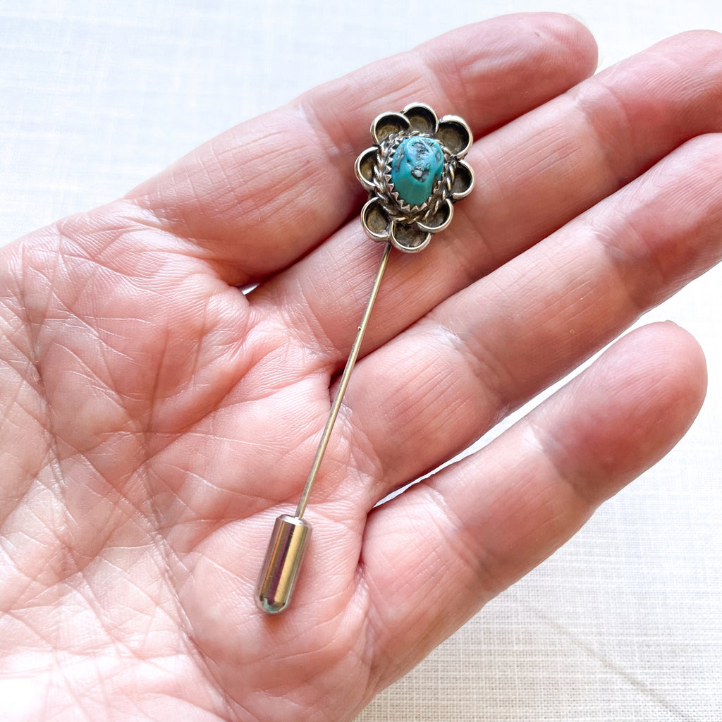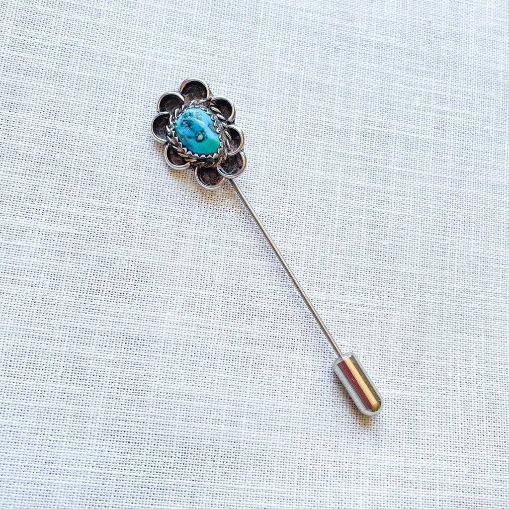 Nice southwestern stick pin with scalloped edges, turquoise nugget stone and sawtooth bezel setting.