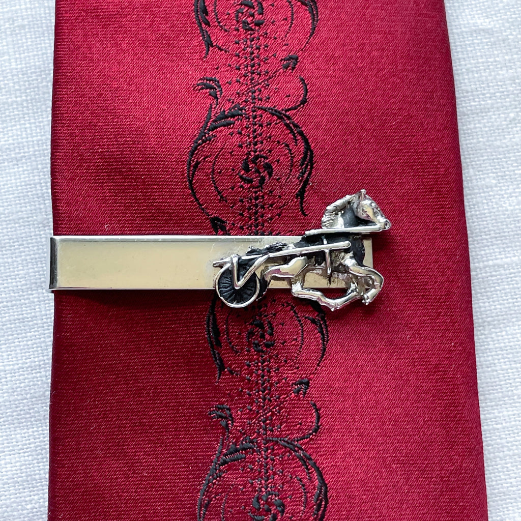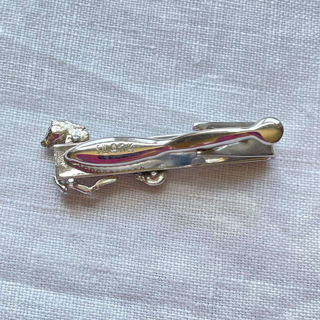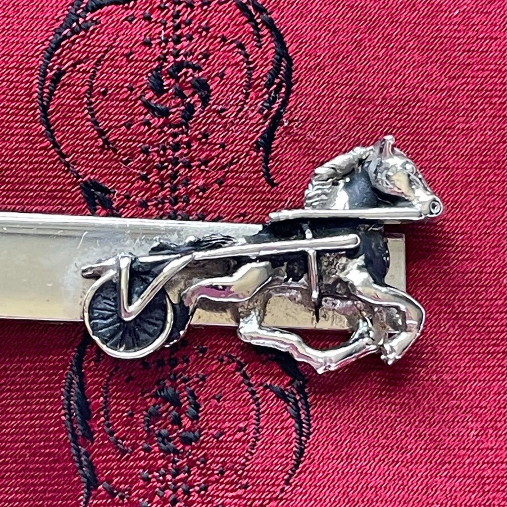Vintage MCM silver tone tie clip with a dimensional raised horse with a harness.
