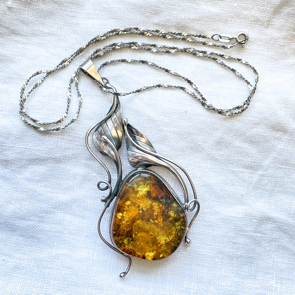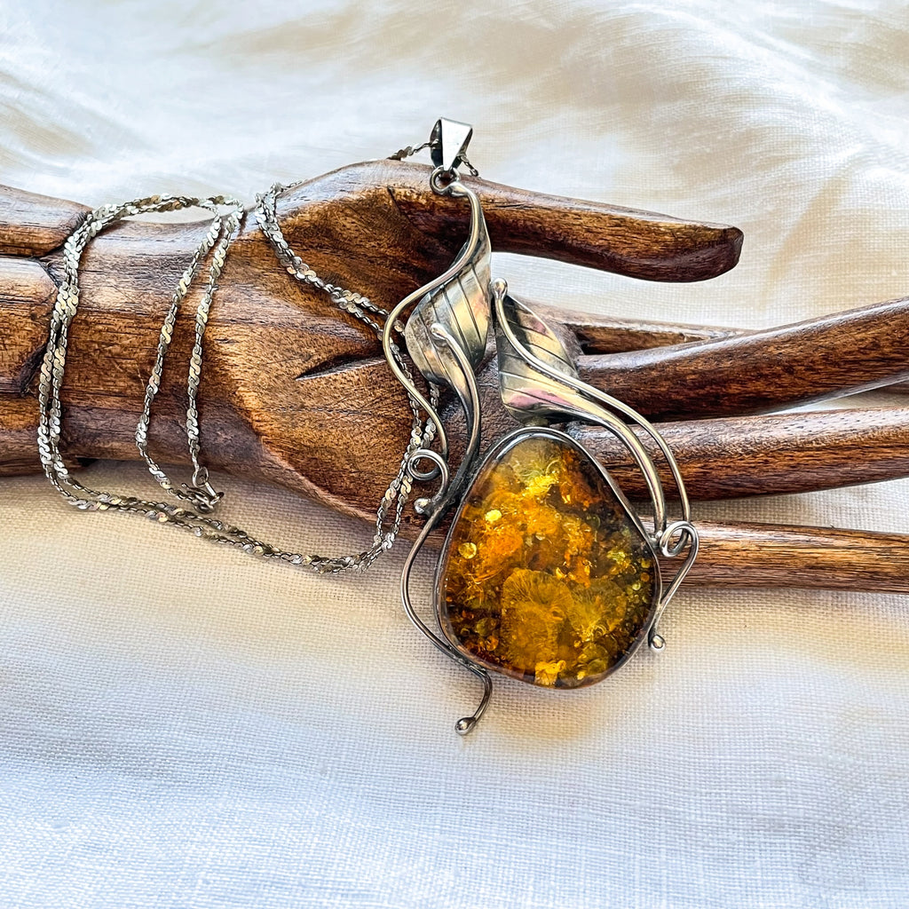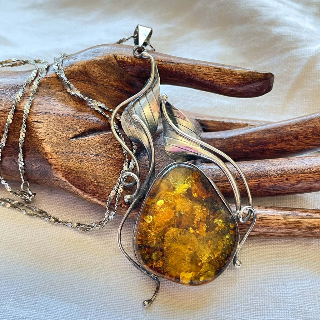 Beautiful vintage Baltic amber sterling silver pendant on a sterling silver necklace.