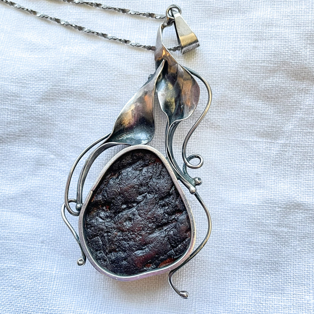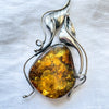 Vintage Baltic Amber Sterling Silver Pendant Necklace, Art Nouveau Style Calla Lilly Flowers