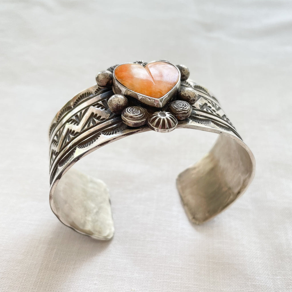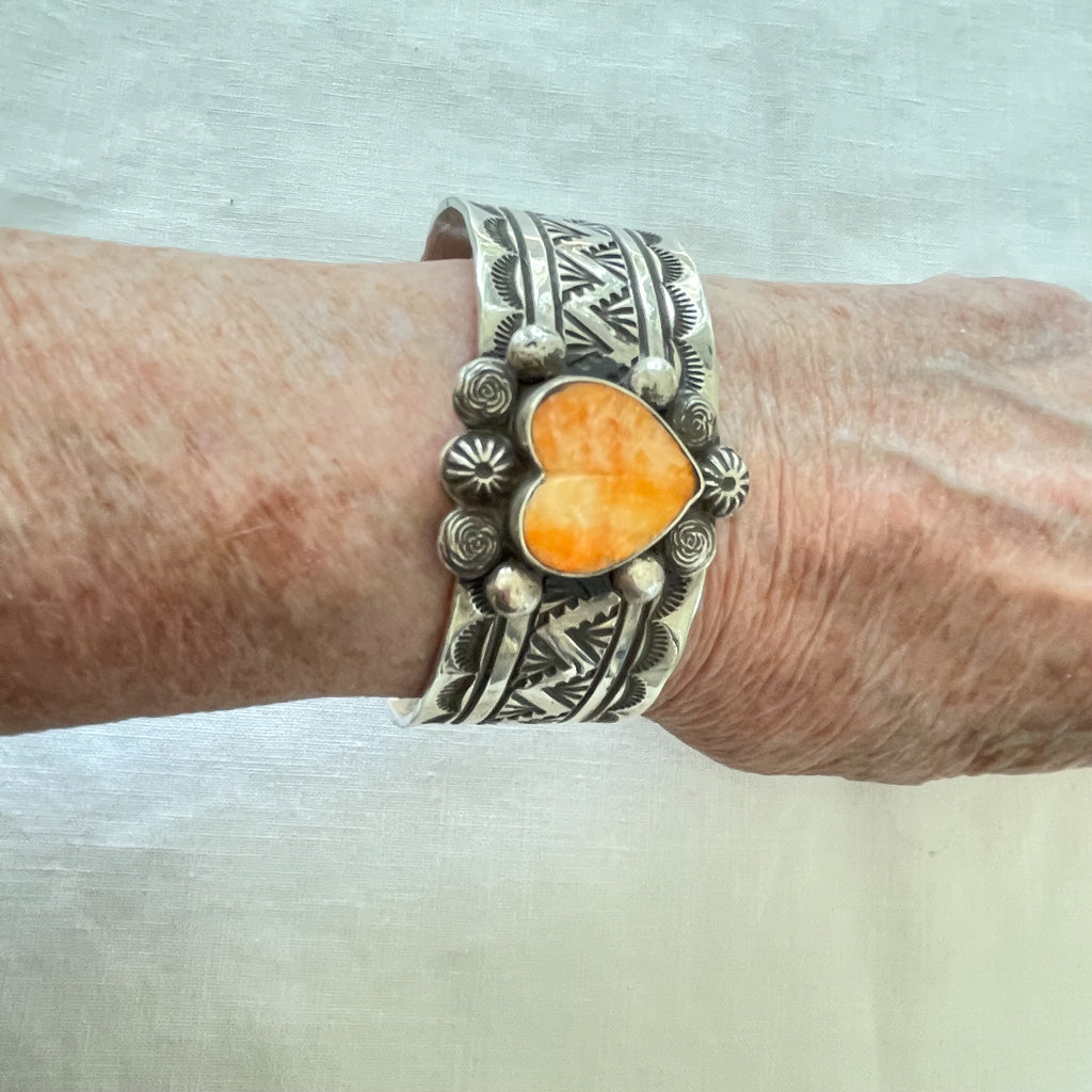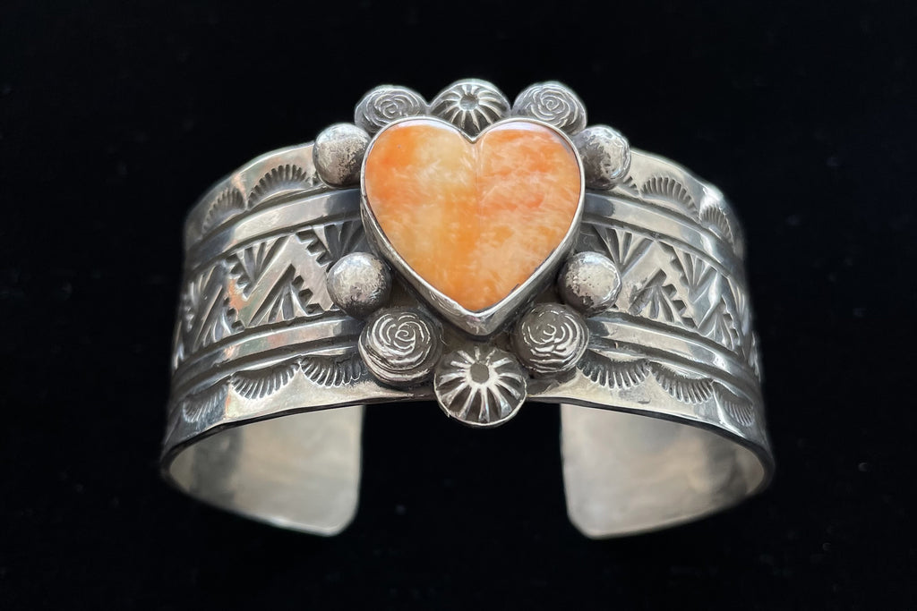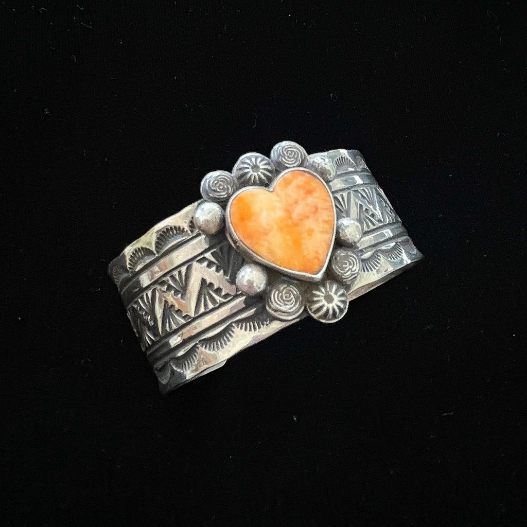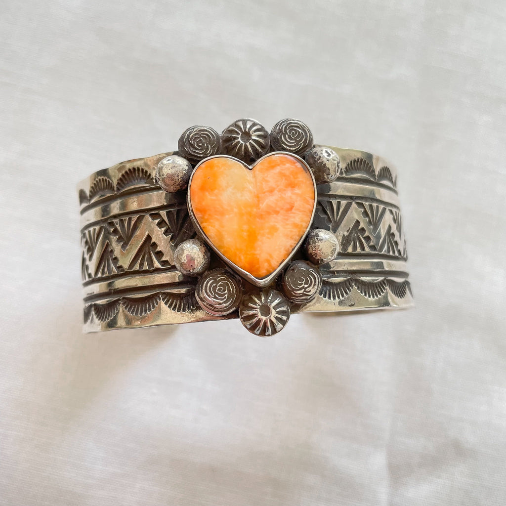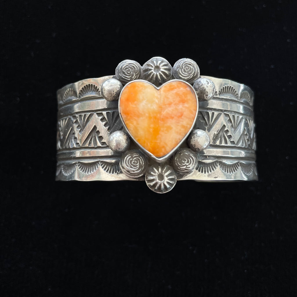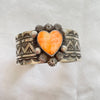 Orange spiny oyster heart shaped stone in the center, bezel set.