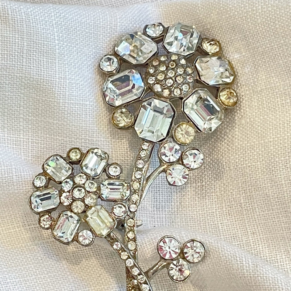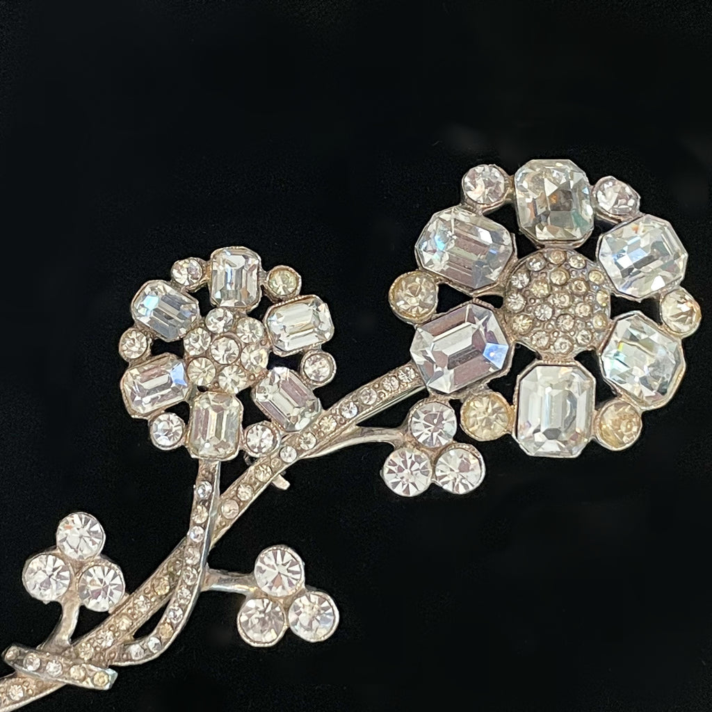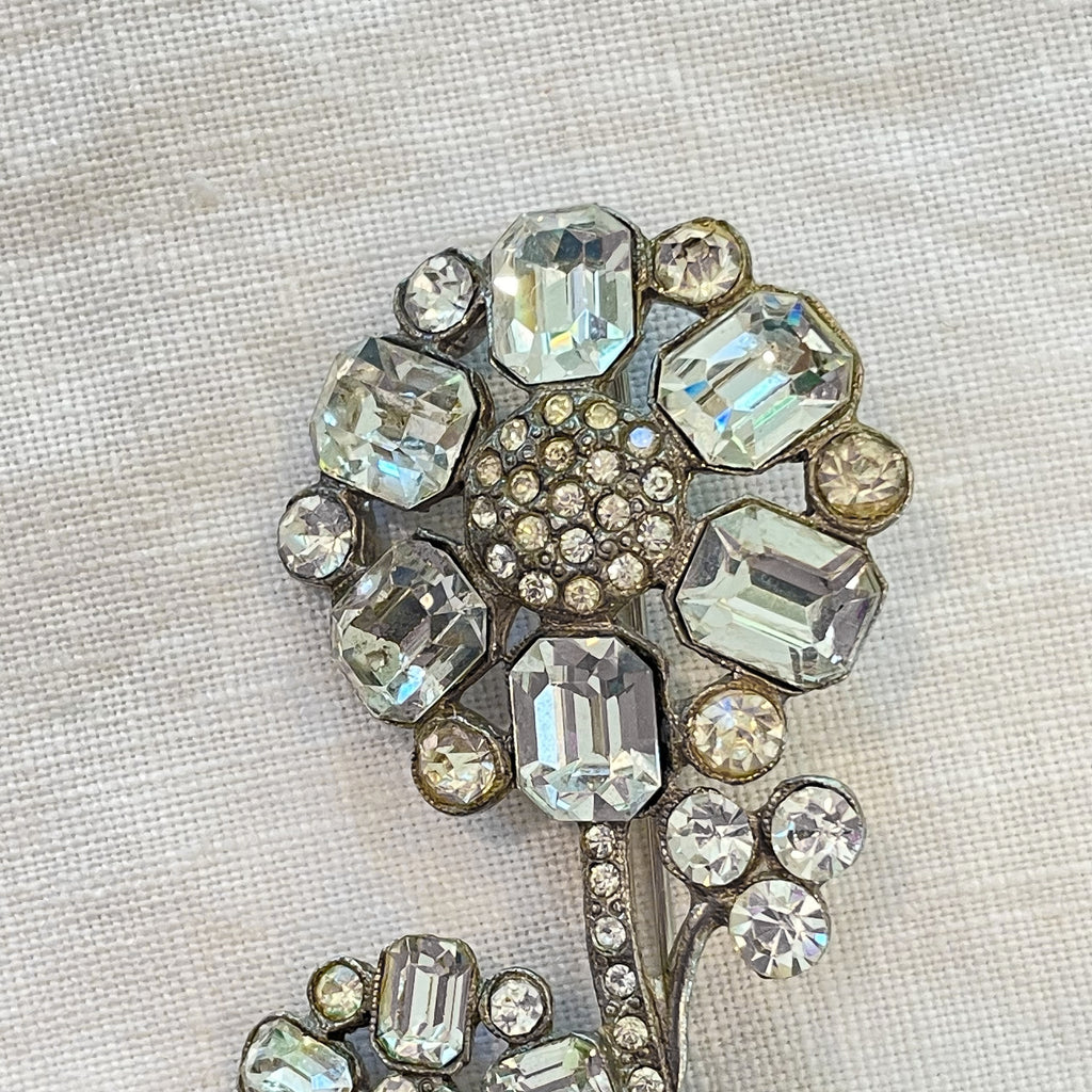 Clear rhinestones, silver tone setting, round and baguette shape stones.