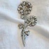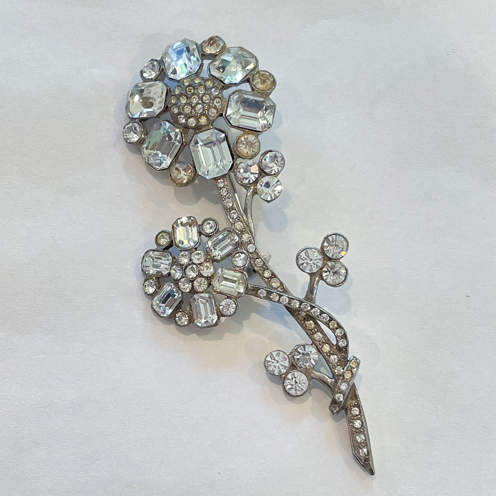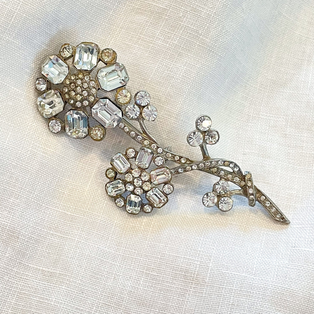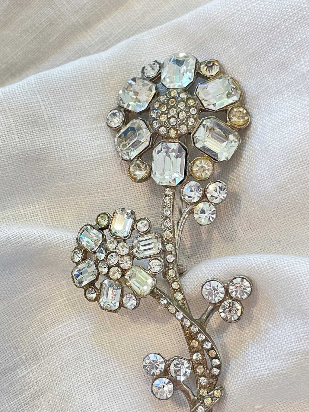 Clear rhinestones, silver tone setting, round and baguette shape stones.