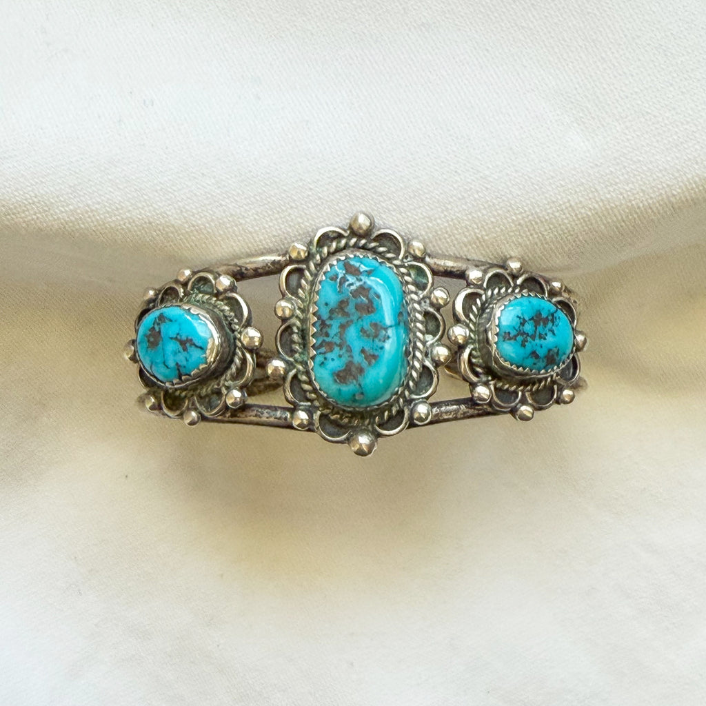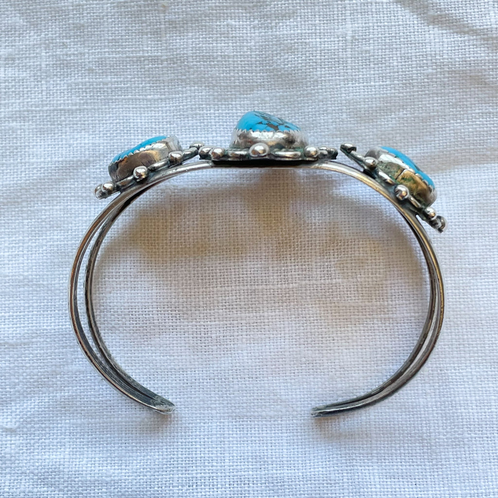 3 bezel set stones on a shank bracelet. Scalloped and ball details.