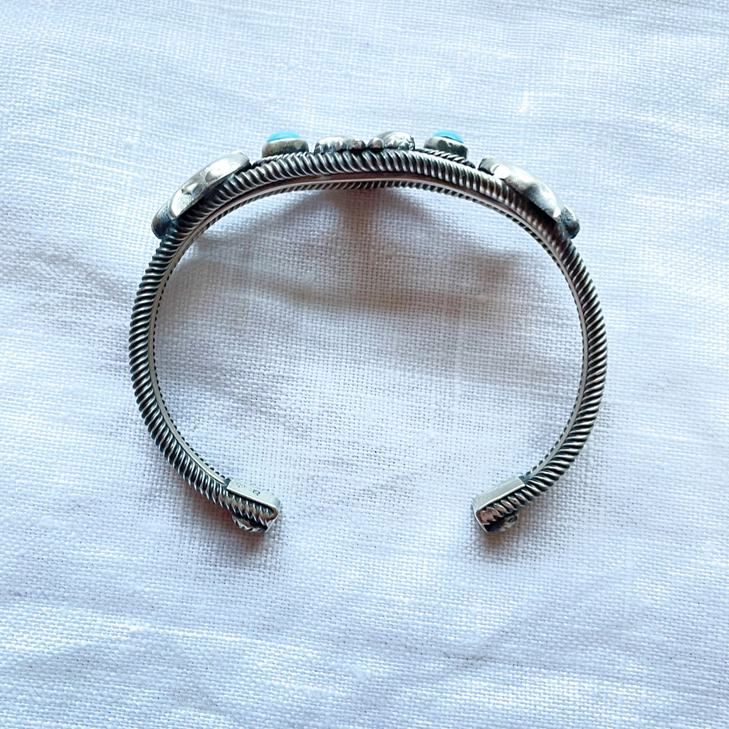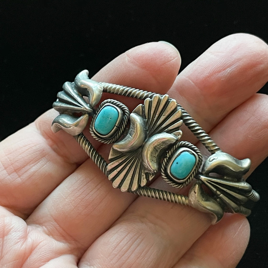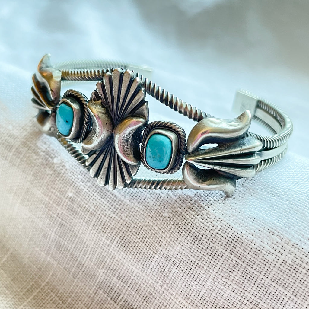 Measures 1 inch wide with two Natural Turquoise stones accenting the Sterling Crescent shape design.