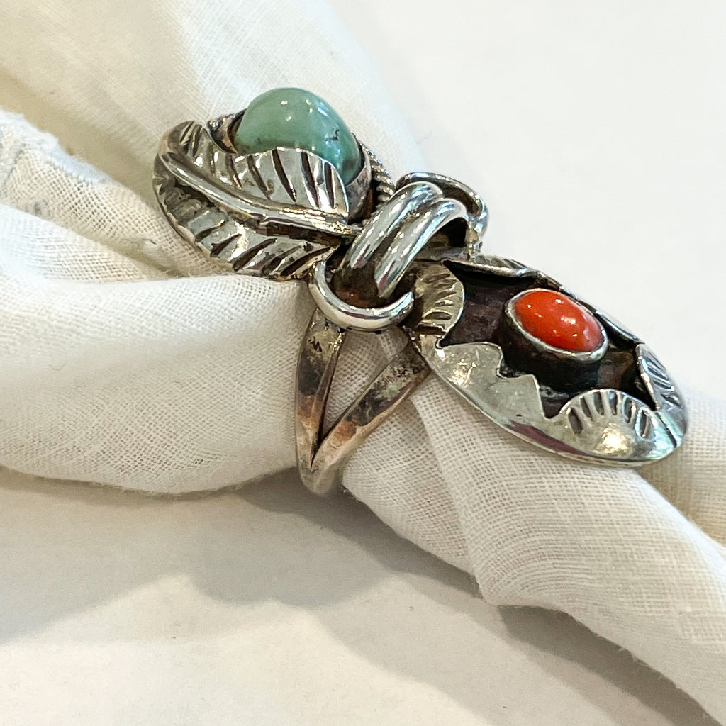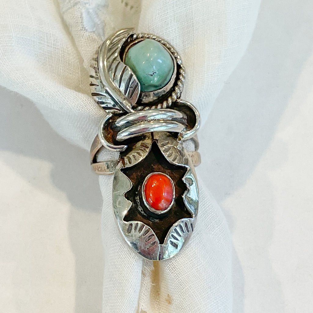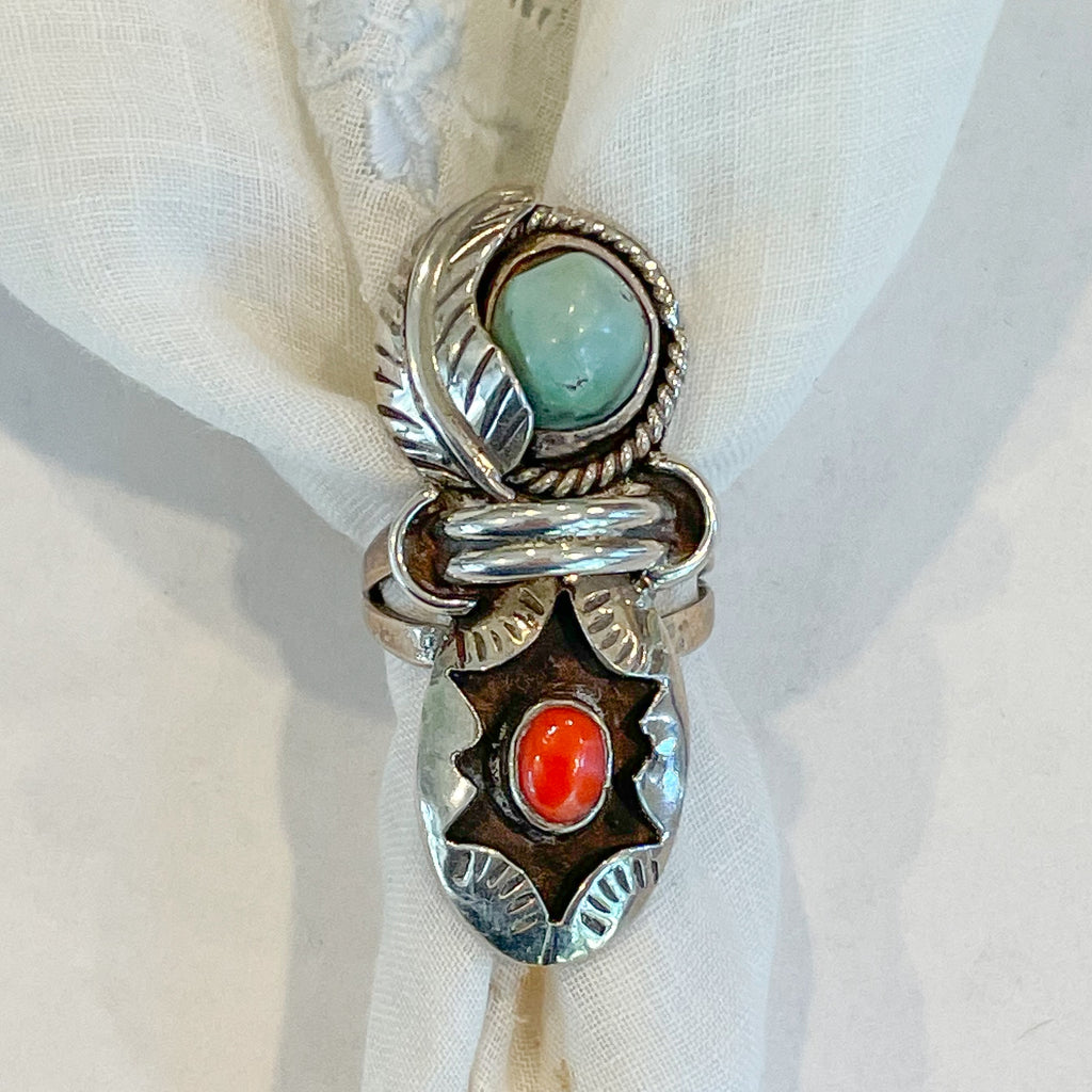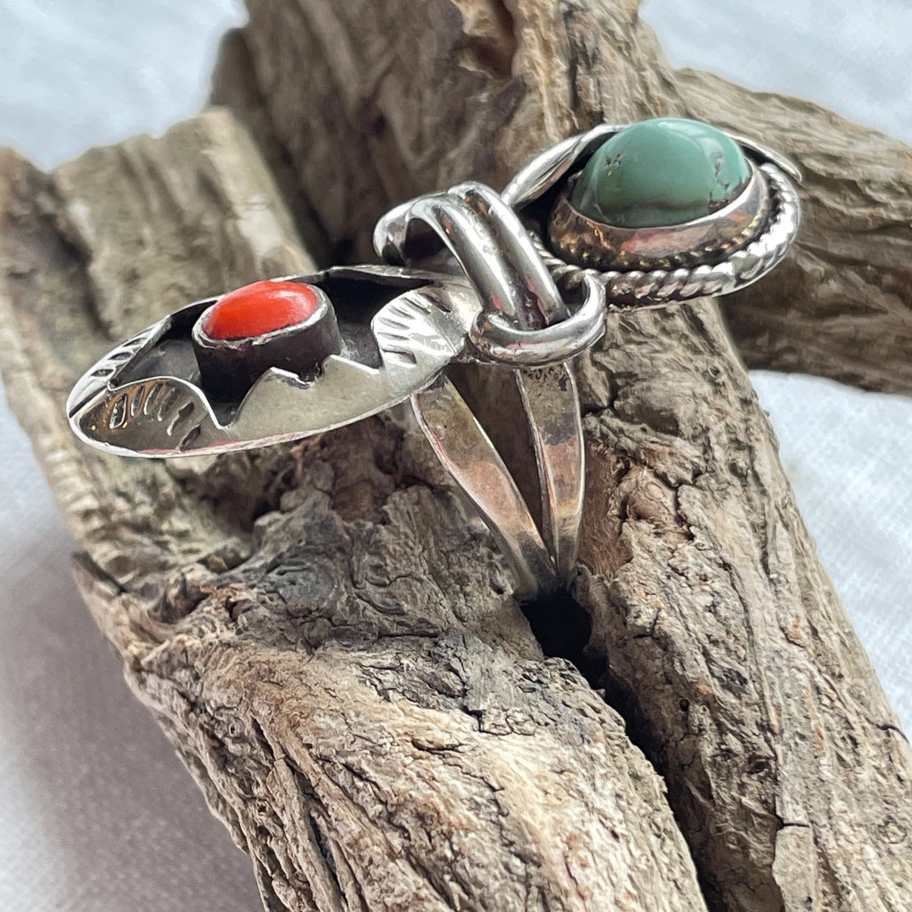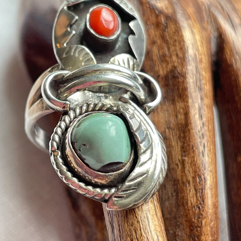 Vintage Navajo Native American Ring, Silver Turquoise Coral Signed JT