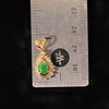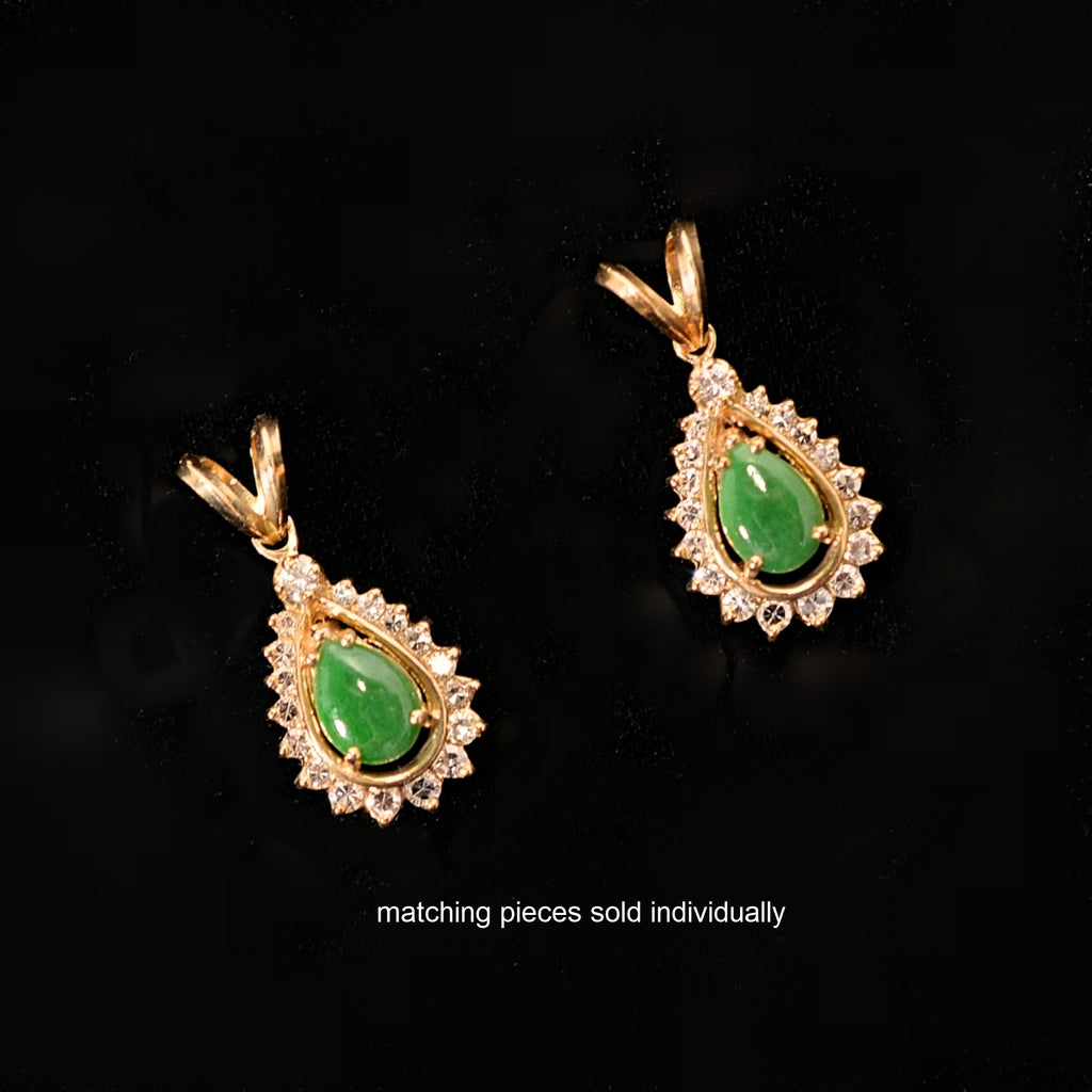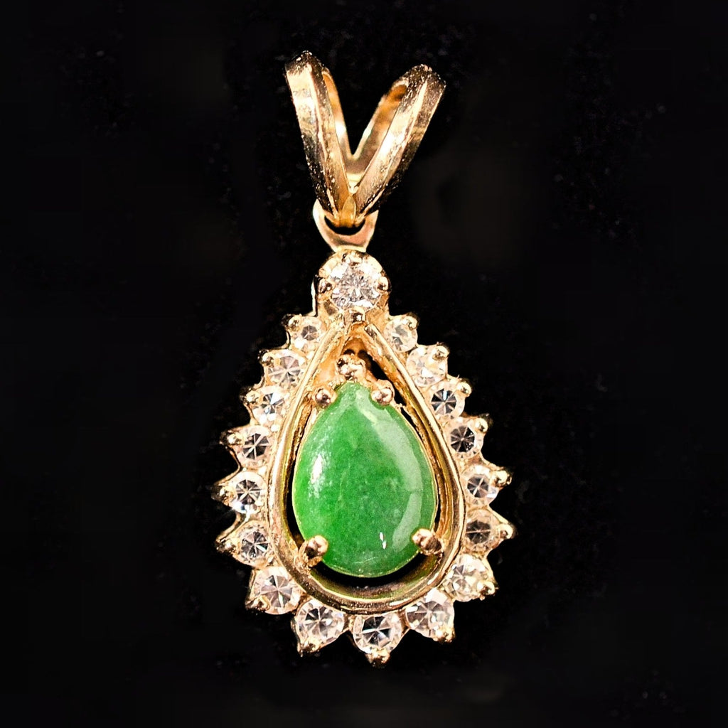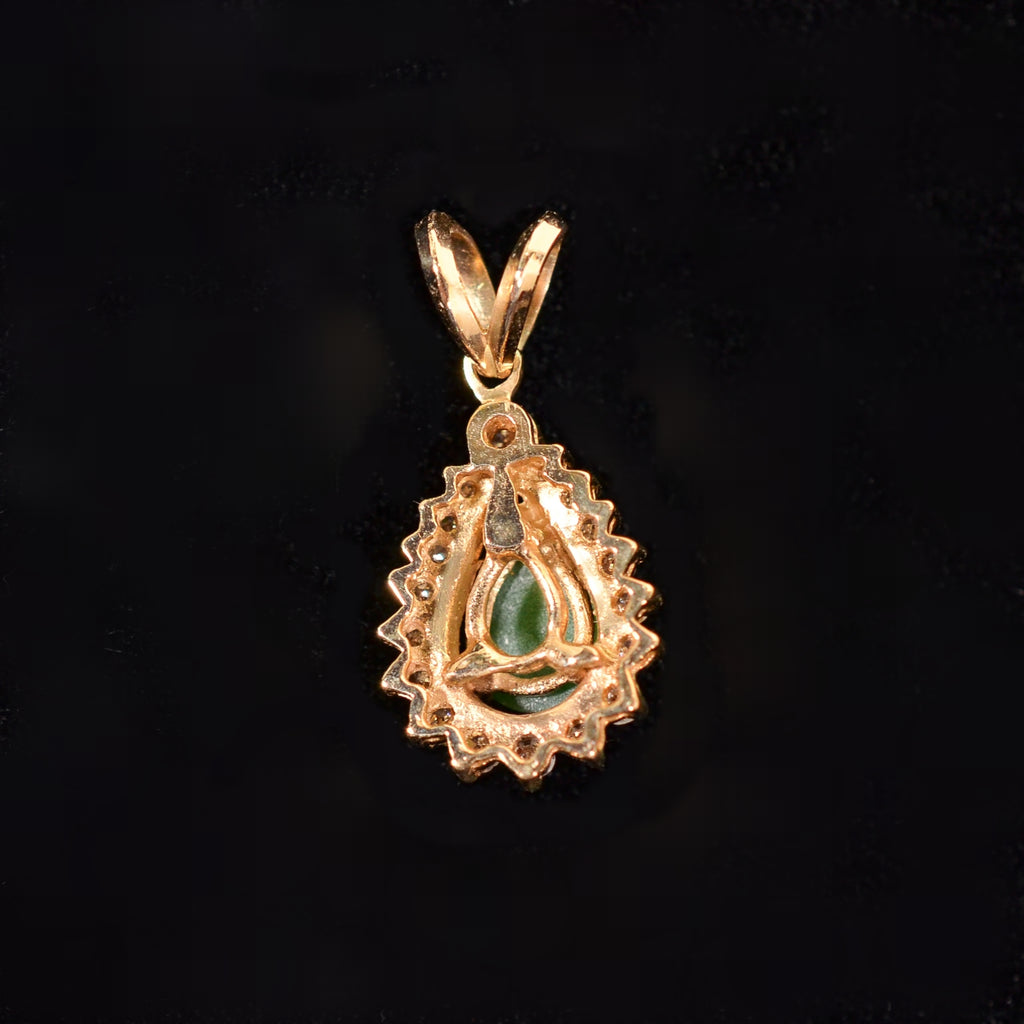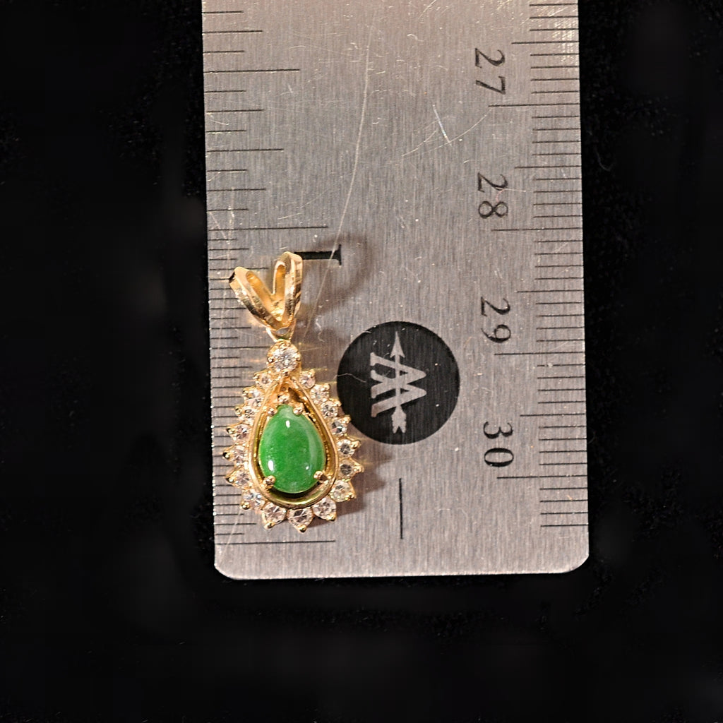 Small green pear-shaped Jadeite, surrounded by small diamonds, set in 14K gold.
