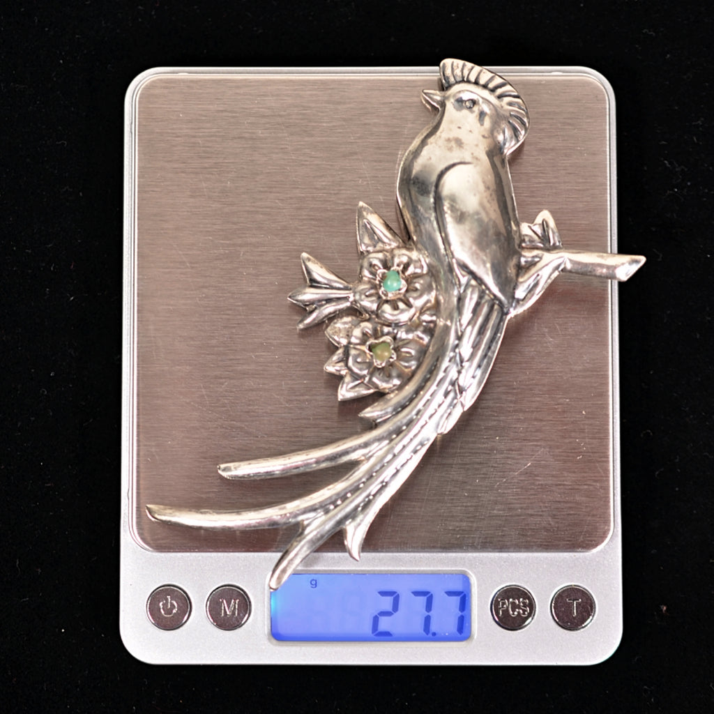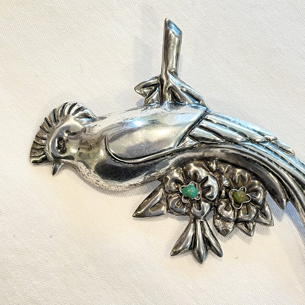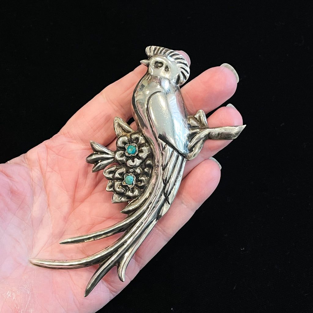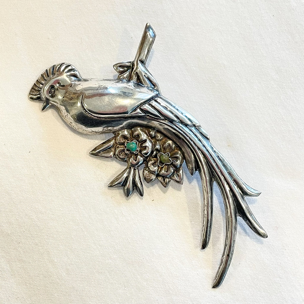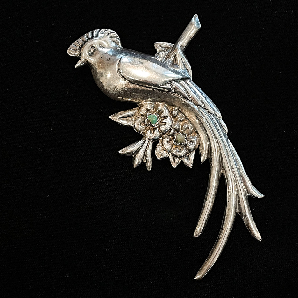 Lovely 1940s Mexican Sterling Silver large quetzal bird brooch.