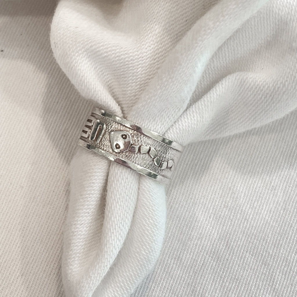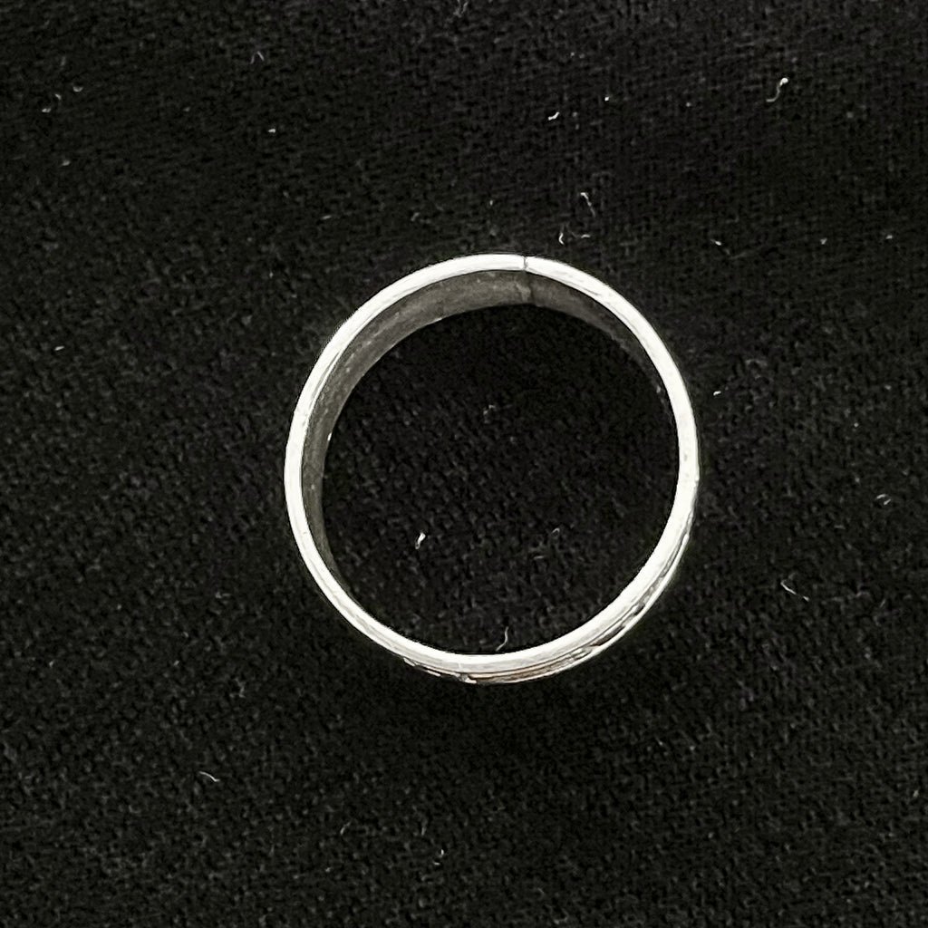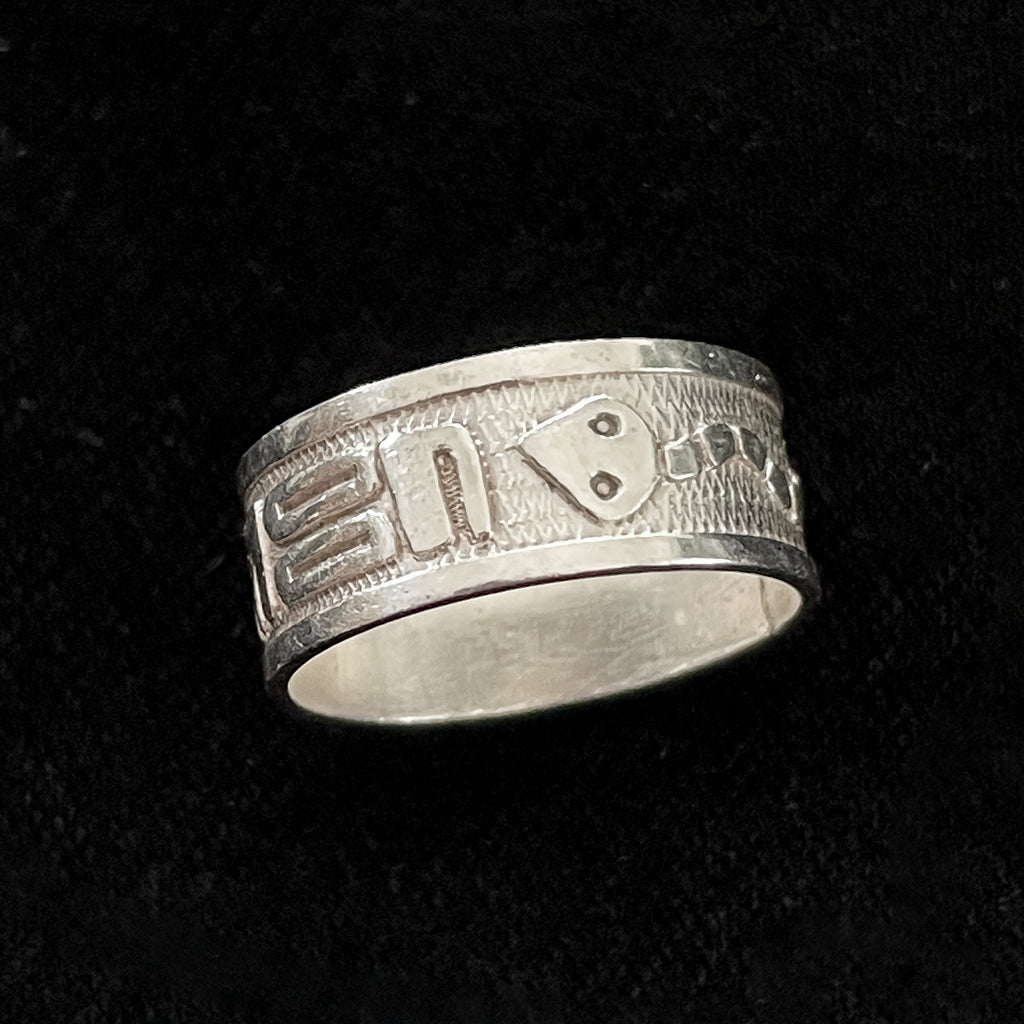 Vintage sterling silver band ring with all over southwestern Mayan pattern.